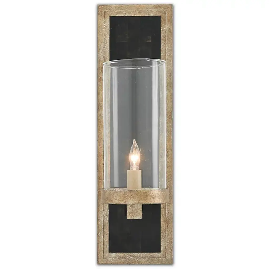 Chic and stylish, the Currey and Company Charade Wall Sconce features a rectangular wall plate paired with a clear glass cylinder shade. The backplate is done in contrasting finishes, with the dark finish having a unique crackle texture. The illumination shines through the translucent glass shade, creating a warm ambiance with a touch of contemporary flair.