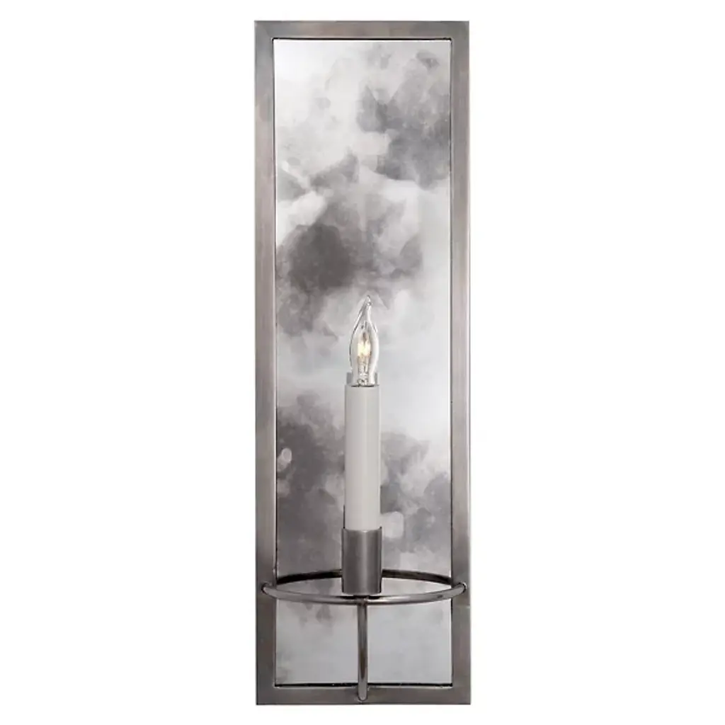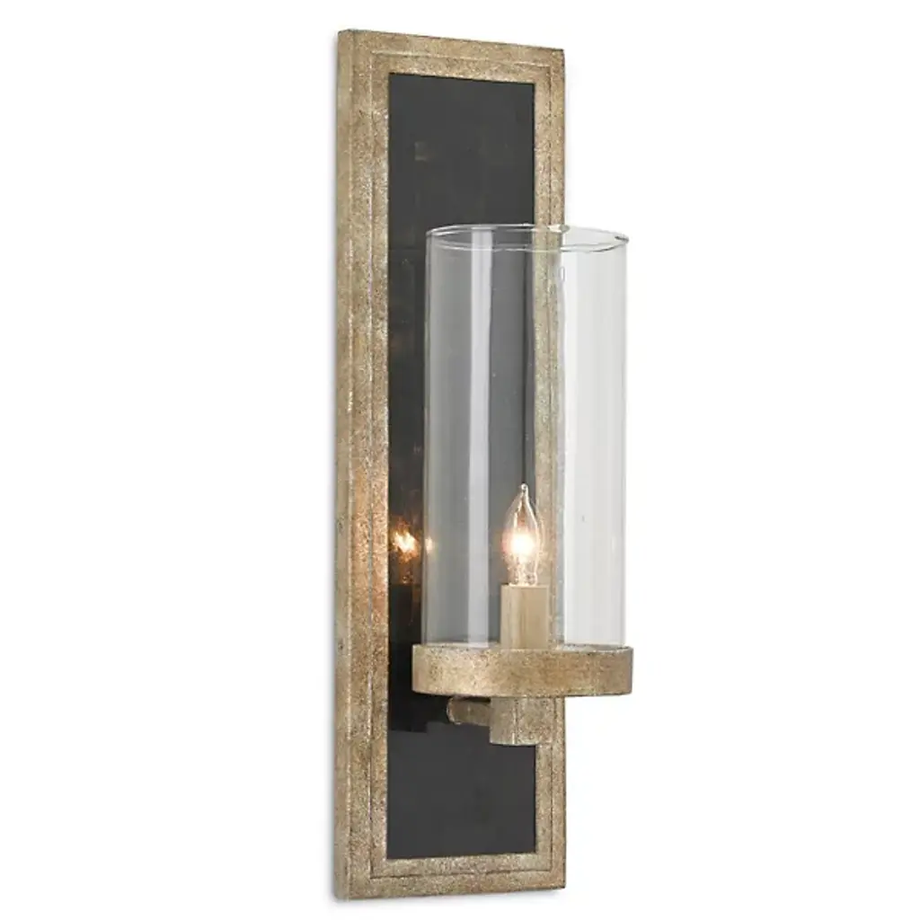 Chic and stylish, the Currey and Company Charade Wall Sconce features a rectangular wall plate paired with a clear glass cylinder shade. The backplate is done in contrasting finishes, with the dark finish having a unique crackle texture. The illumination shines through the translucent glass shade, creating a warm ambiance with a touch of contemporary flair.