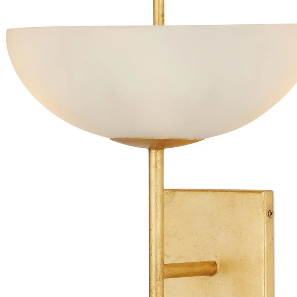 The Charlie wallchiere sconce features modern shapes and beautiful symmetry. Its wrought-iron stem has a vibrant gold-leaf finish with a gentle patina. White composite bowls emit an inviting glow when lit.