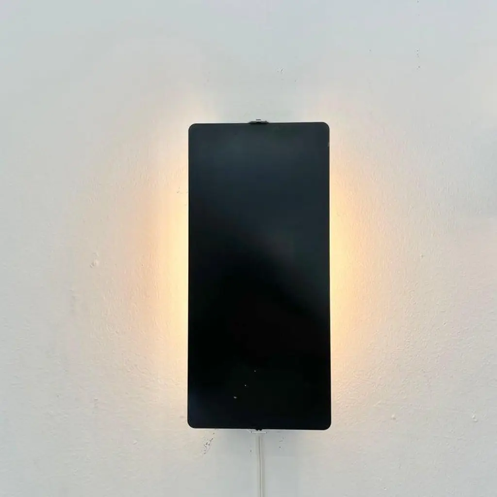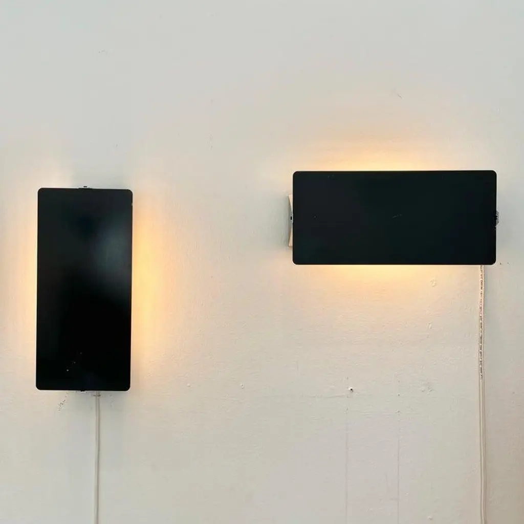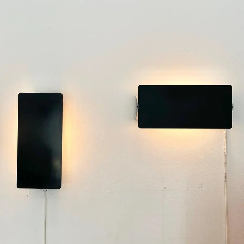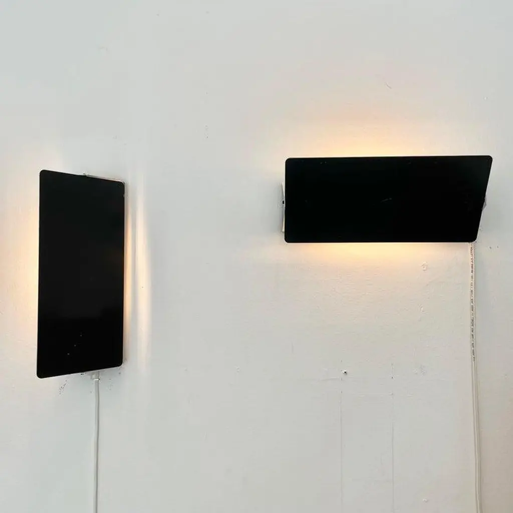 Rare large scale, enameled wall lights by Charlotte Perriand with adjustable steel reflectors in black enameled finish with two sockets each. Made in the 1960s. Optional horizontal or vertical mount. Newly rewired for US standards. 8 currently in stock and available. Priced individually. Located at our Los Angeles location.