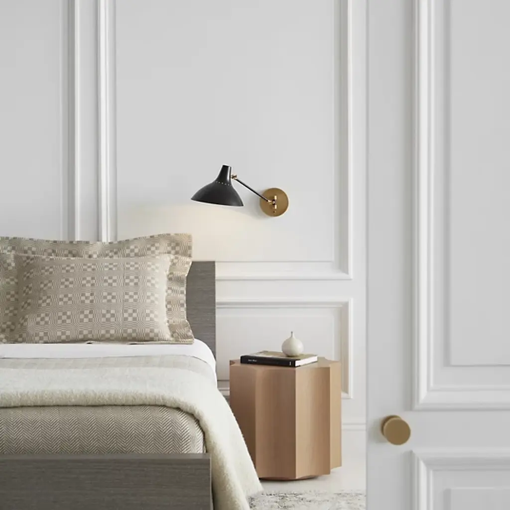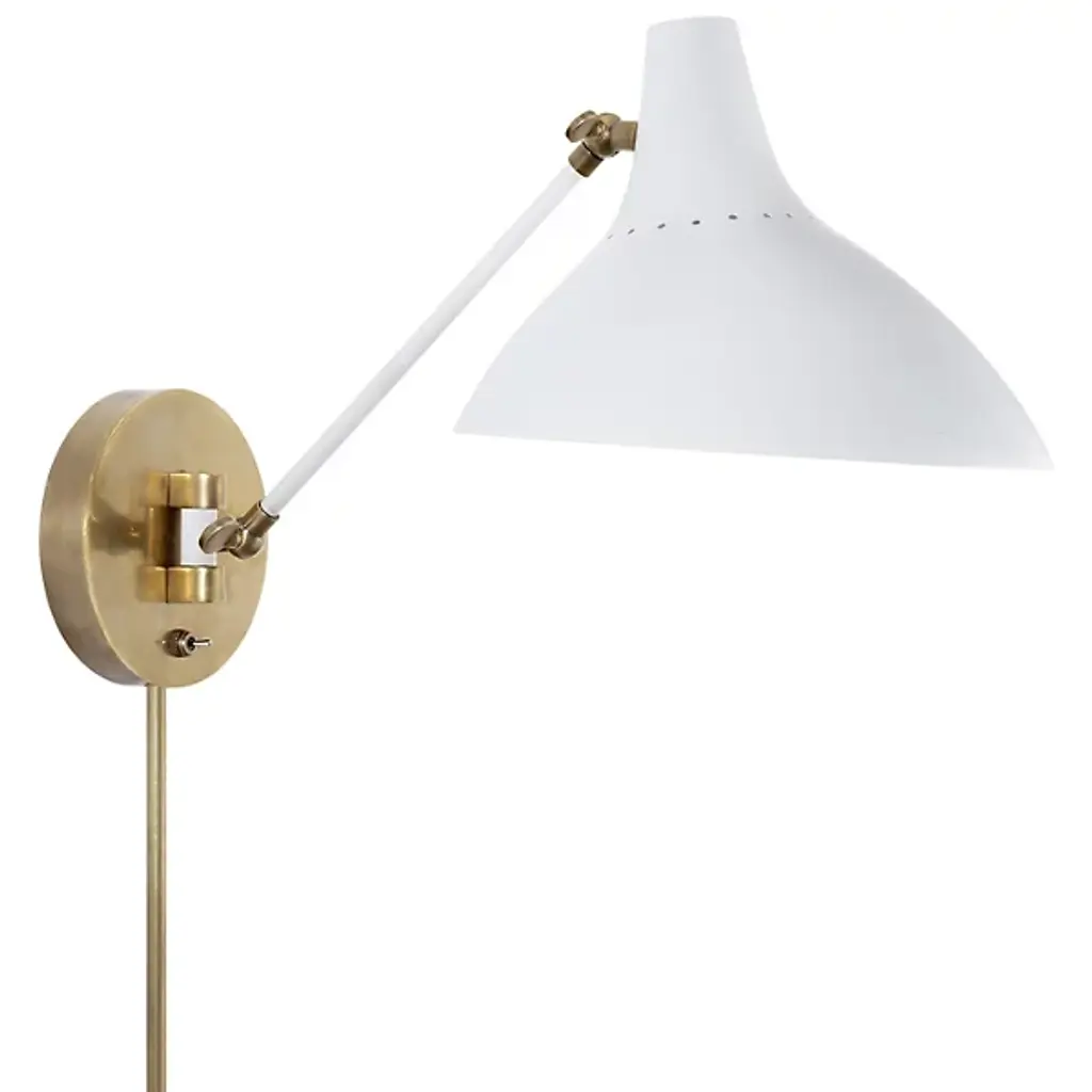 The Charlton Wall Sconce by Visual Comfort Signature, formerly known as Visual Comfort, provides convenient lighting for a variety of settings, featuring an adjustable, double-jointed body and an artisan-cut shade. Contrasting finishes segment the fixture beautifully, adding a decorative flourish that complements its versatility. Anchored by a low-profile wallplate with toggle switch.