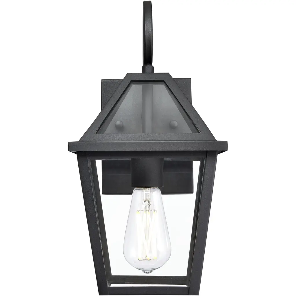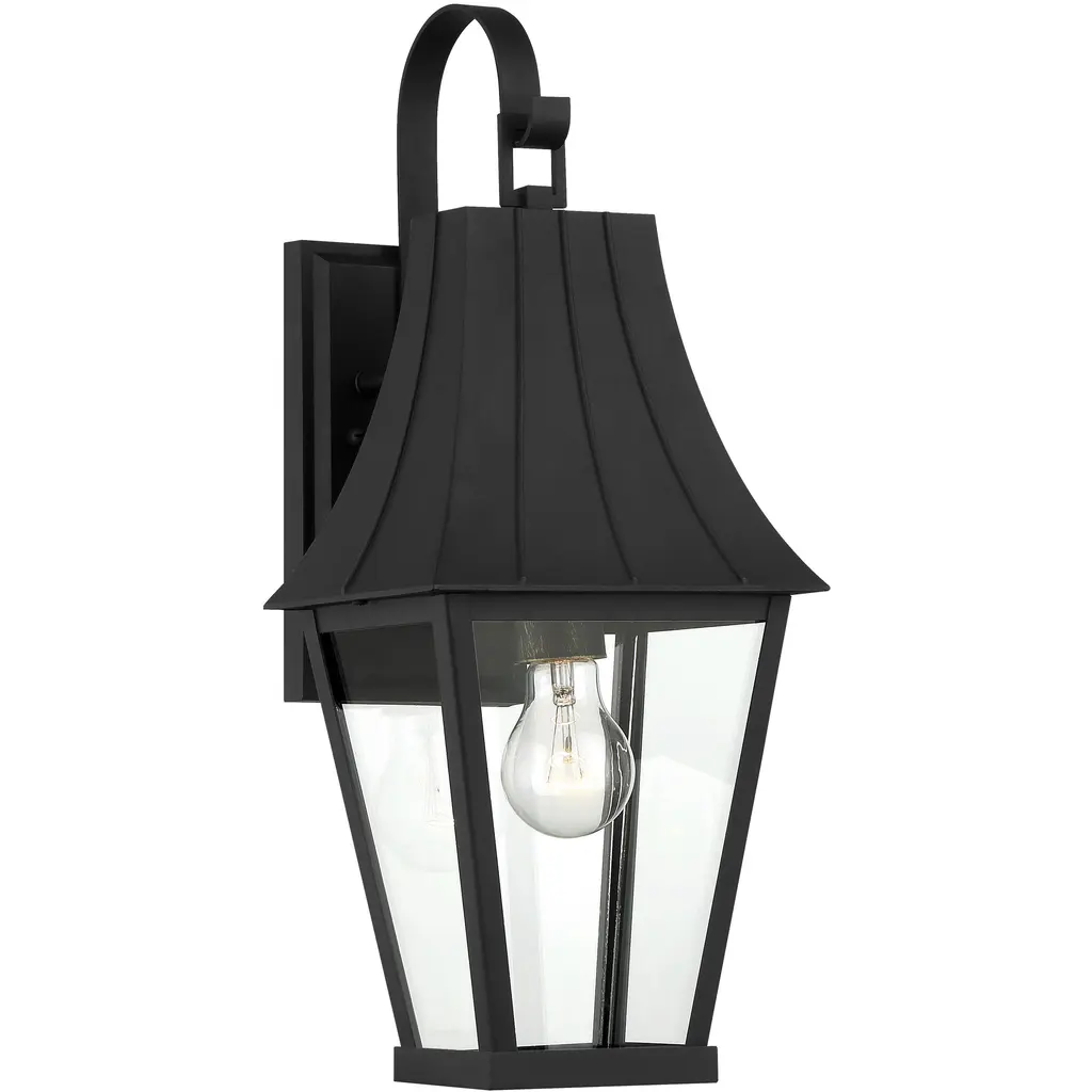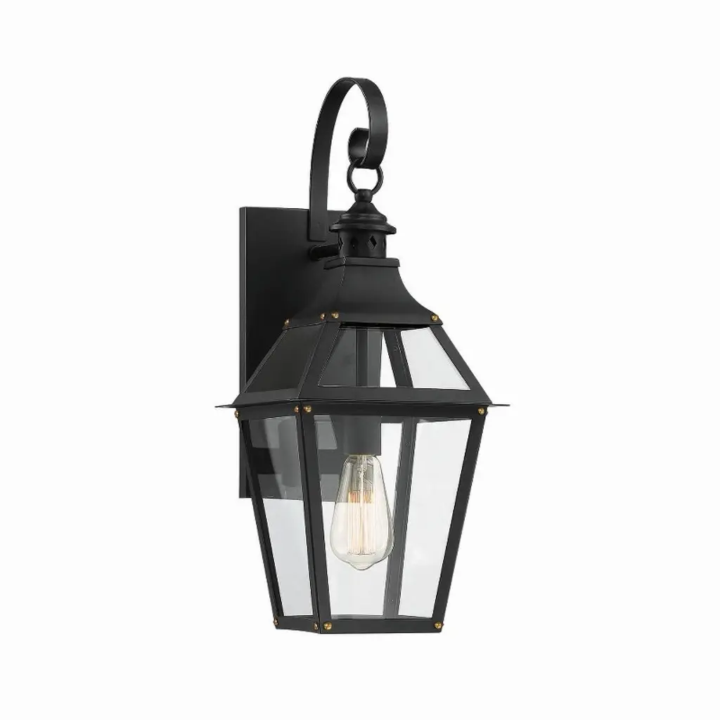 The Chateau Grande Outdoor 1-Light Wall Sconce by The Great Outdoors is a handsome addition to spaces that brings an updated look to a classic, lantern-style design. Anchored by a rectangular backplate, a gracefully curved arm furls into a hook that a decorative loop hangs over, supporting this wall sconce. With a gradually sloped, ribbed hood and slightly tapered body, this design houses a single light source within glass panels to offer an even, welcoming layer of illumination to surroundings as a bold finish gives this piece a tailored look that is at home in a range of locations.