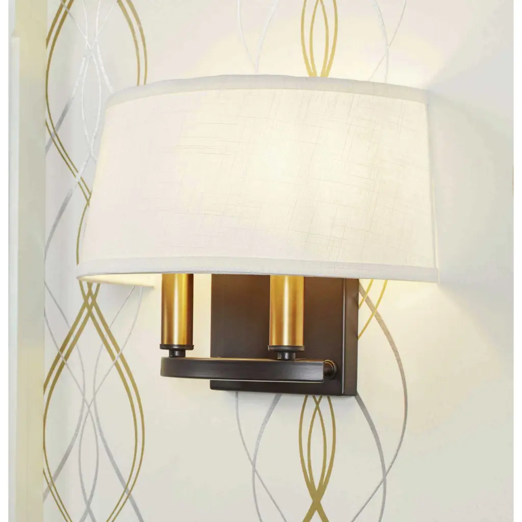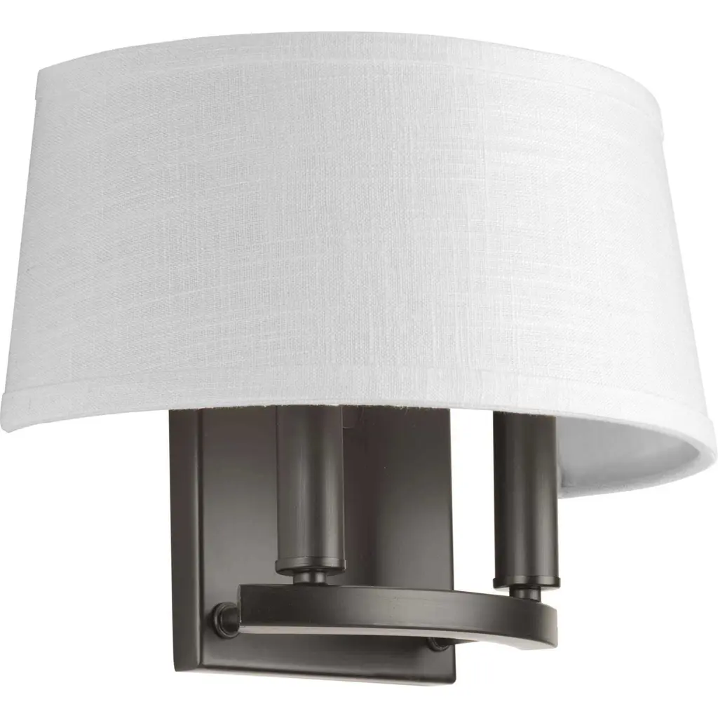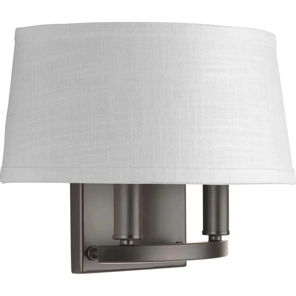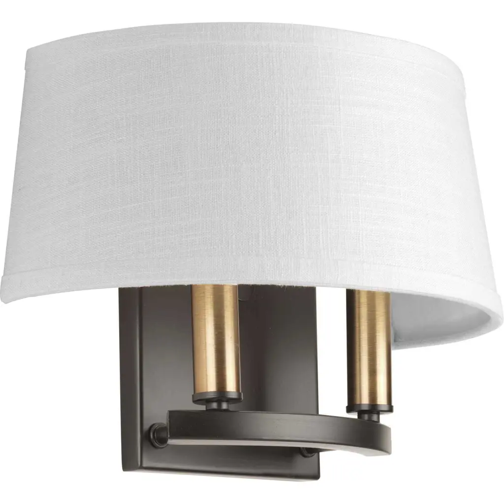 Classic two-light elegant wall sconce modernized with a summer linen shade. The fixture includes both bronze and antique brass candle cover options to allow homeowners to complement mixed metal styling within a room.