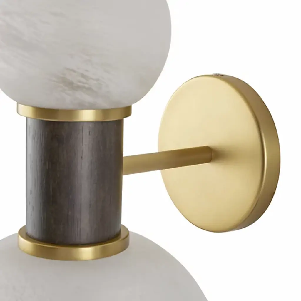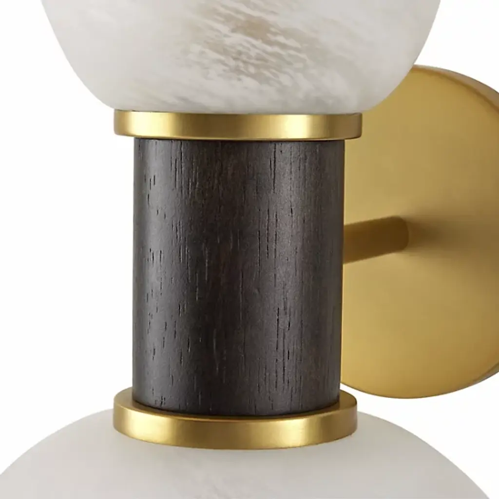 The Celestial Wall Sconce from Arteriors captivates with its unique dumbbell-style design, featuring offset globes of opal swirl glass. The fixture is centered with a gray-washed wood neck and mounted on an antique brass plate, enhancing its vintage appeal. Its large scale makes it particularly striking when installed in multiples, offering versatile mounting options horizontally or vertically. Each piece varies in finish, ensuring a distinctive touch in any setting, perfect for adding style and intrigue to your decor.