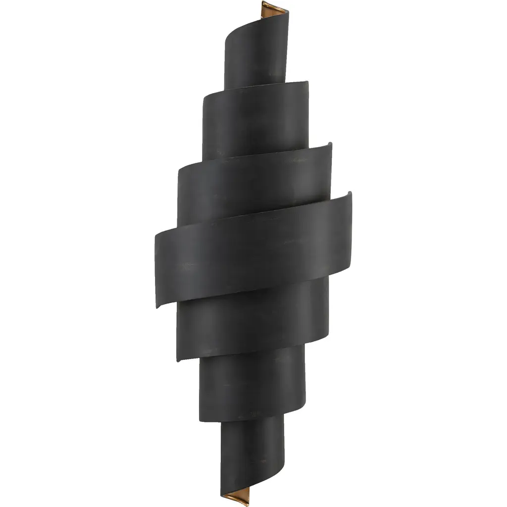 Any way you slice it, our Chiffonade Wall Sconce has an elegant fluidity in its lines that curl toward the wall and end at the top and bottom with a lovely swirl. Made of wrought iron, the exterior of this sconce has been treated to a French black finish. To heighten the gracefulness of the piece, we’ve treated the interior to a painted gold finish. This also brings a warm glow to the illumination that wafts from between the arcing bands of metal.
