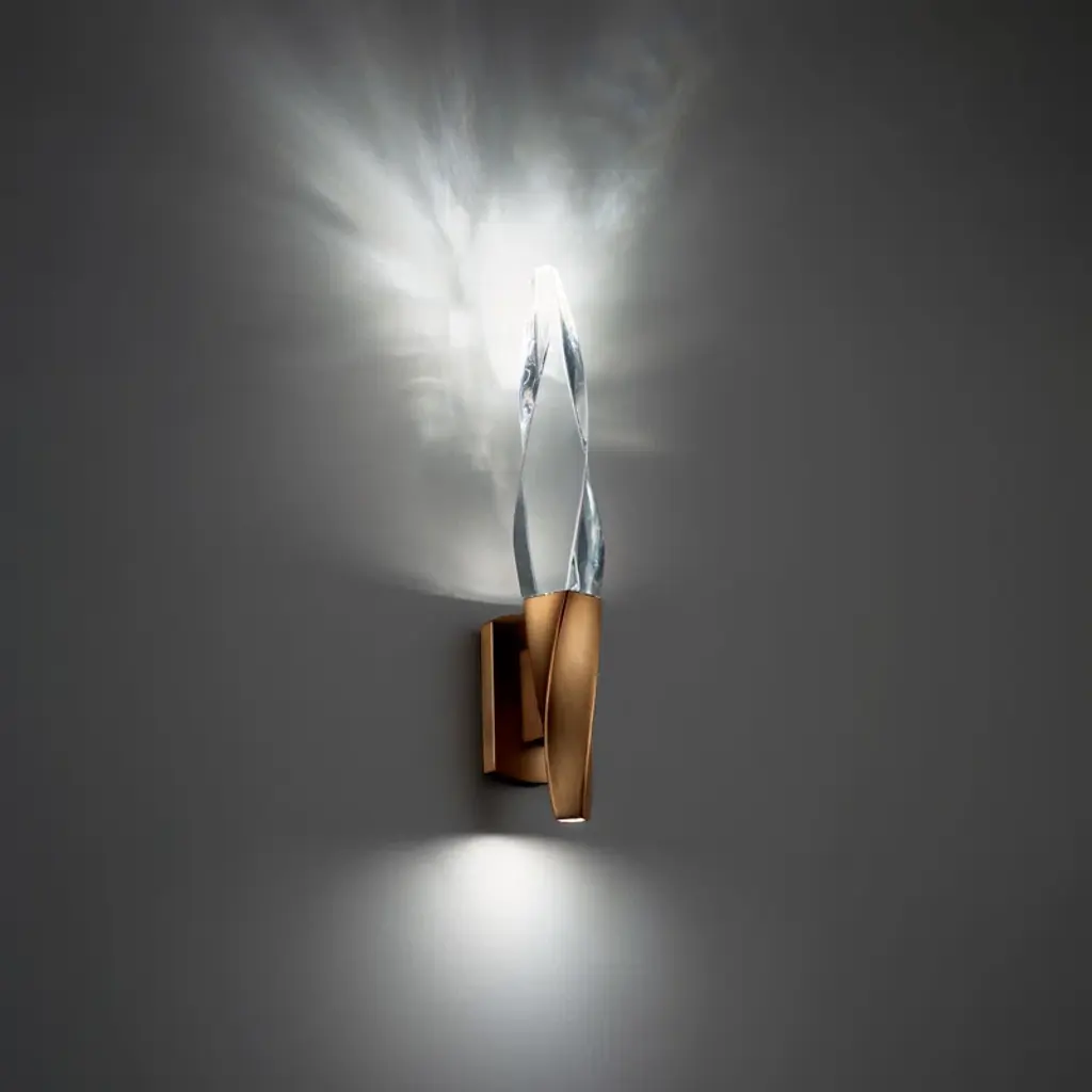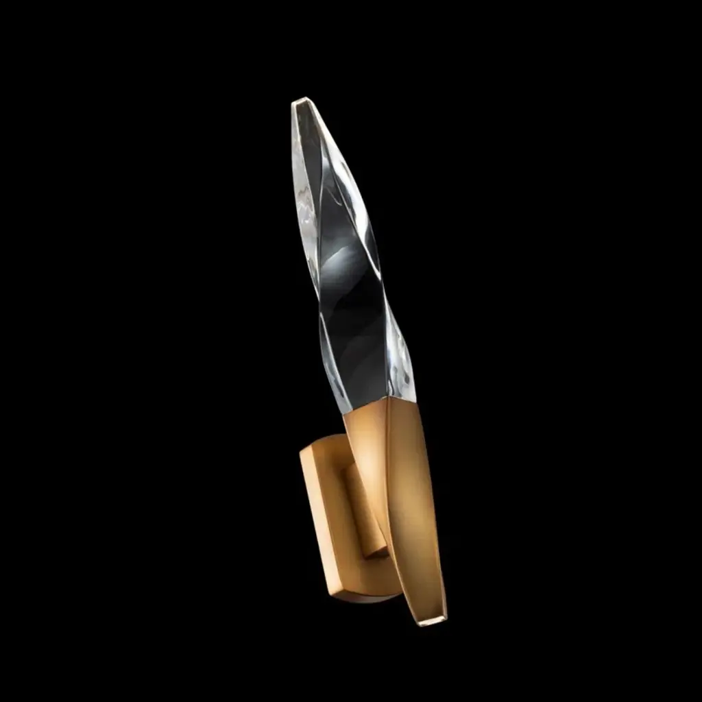 A subtle twist of luxe. Kindjal features an exquisite optic crystal icicle that twists to a point from a cohesive metal casting that conceals powerful LEDs that provides ample illumination. Stylish, textured materiality.
