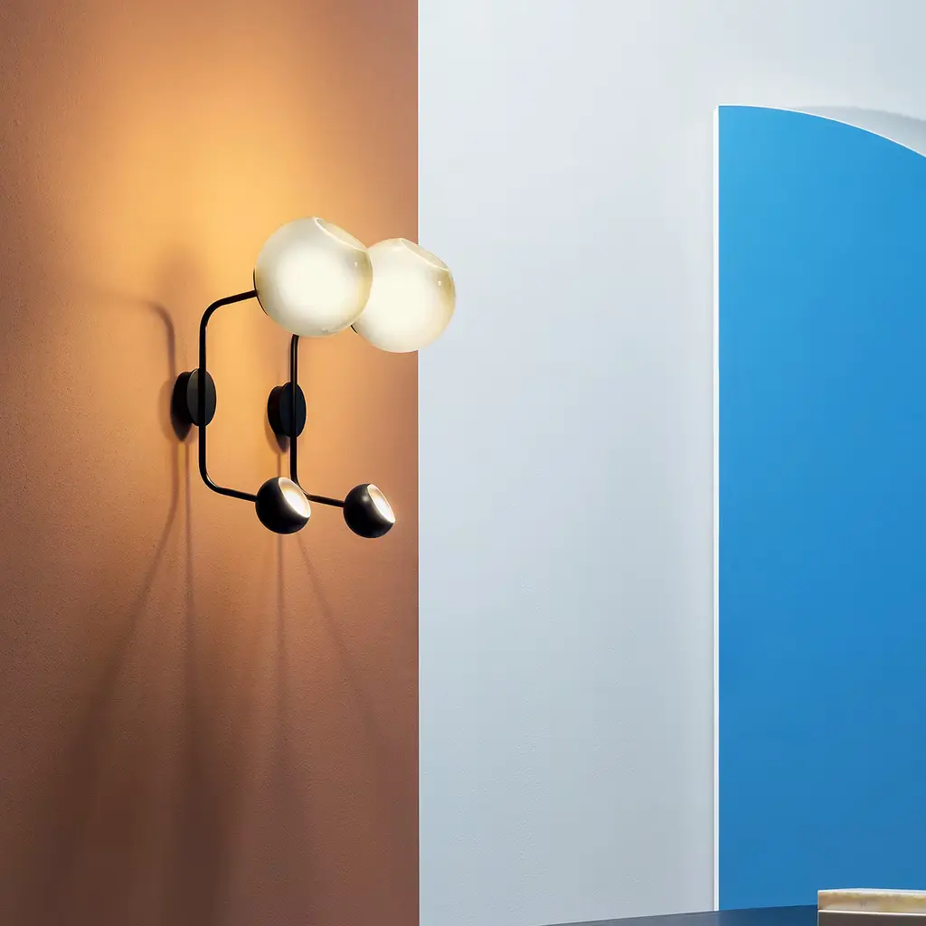 Showcasing a sleek and essential design, the Chill sconce effortlessly highlights the charm of a contemporary piece of functional decor. Its matte-lacquered black structure supports two semi-spheres: one crafted of smoked Murano glass hosting an E27 max 10W bulb for a subdued light, and a smaller one in metal with an LED light for a more direct projection.