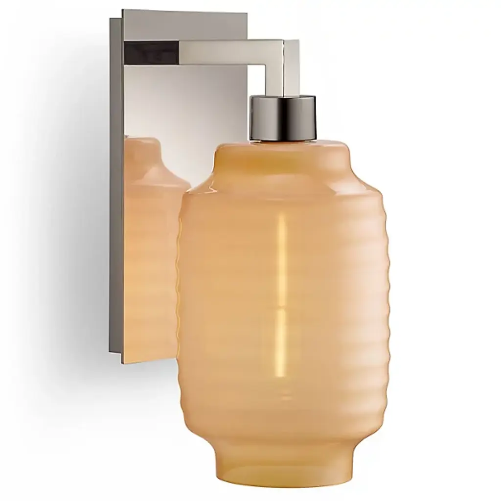 The Chinois Wall Sconce from Niche provides a welcoming artisanal accent to walls. A design by Jeremy Pyles that adds memorable traditional appeal to an otherwise conventional structure, it uses a sleek, rectangular wall plate with a plateau-style face to secure an angular arm and downward-facing single-socket lamping. A Handblown Glass shade reminiscent of Chinese paper lanterns races down around the lamping, its ring-contoured sides standing out from the smooth transitions to slightly narrower upper and lower ends, creating a warm glow accented by a blend of direct wall wash and focused spotlight through the open base of the shade.