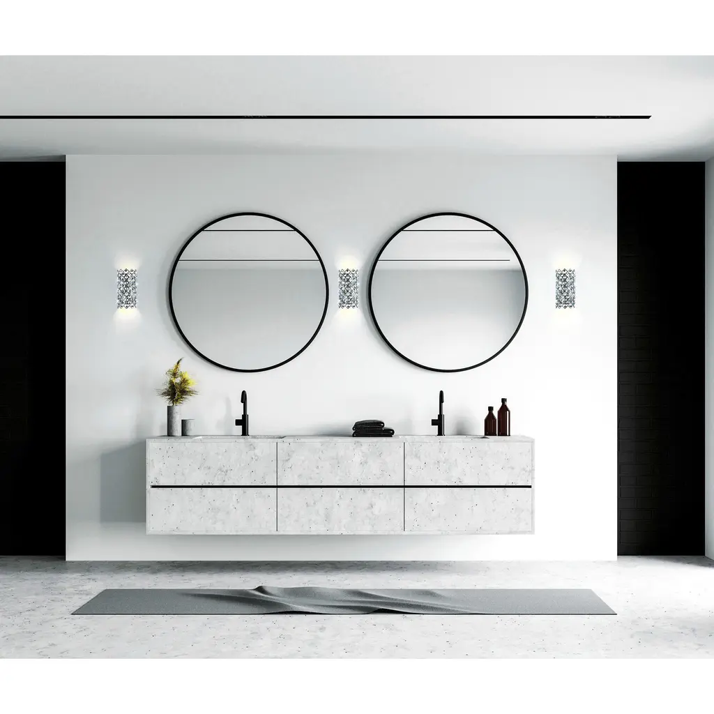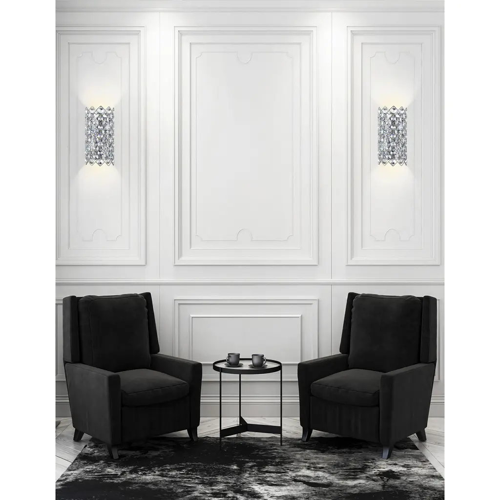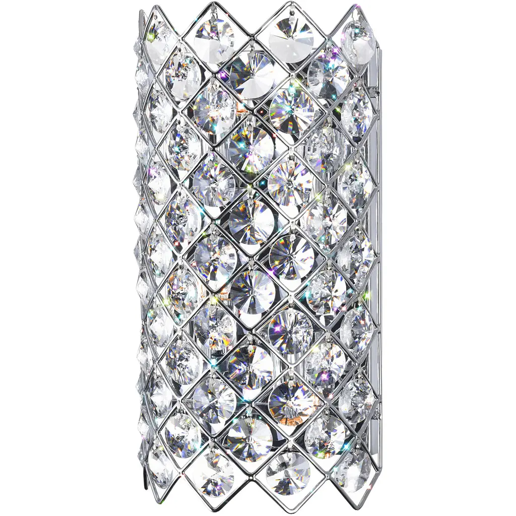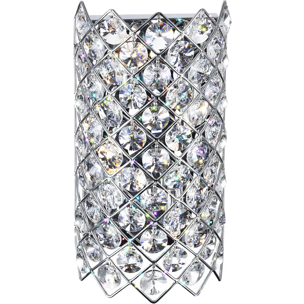 This breathtaking Chique 7'' 4-Light Wall Sconce with Chrome Finish is a beautiful piece from our Chique Collection. Featuring a sleek chrome frame arranged in an elegant argyle pattern, this wall light is embellished with round crystals that refract and reflect light for maximum sparkle. Ideal for compact spaces like powder baths, hallways, or cozy living rooms, this glamorous fixture is compatible with G9 LED bulbs (sold separately) to provide bright, energy-efficient lighting while elevating your decor with a diva-esque flair. Finish: Chrome Light Count: 4 Light Source: G9 Bulbs (Bulbs Not Included) Adjustable Hanging Height: N/A (Wall Mount) Material: Metal and Crystal Style: Modern / Glam