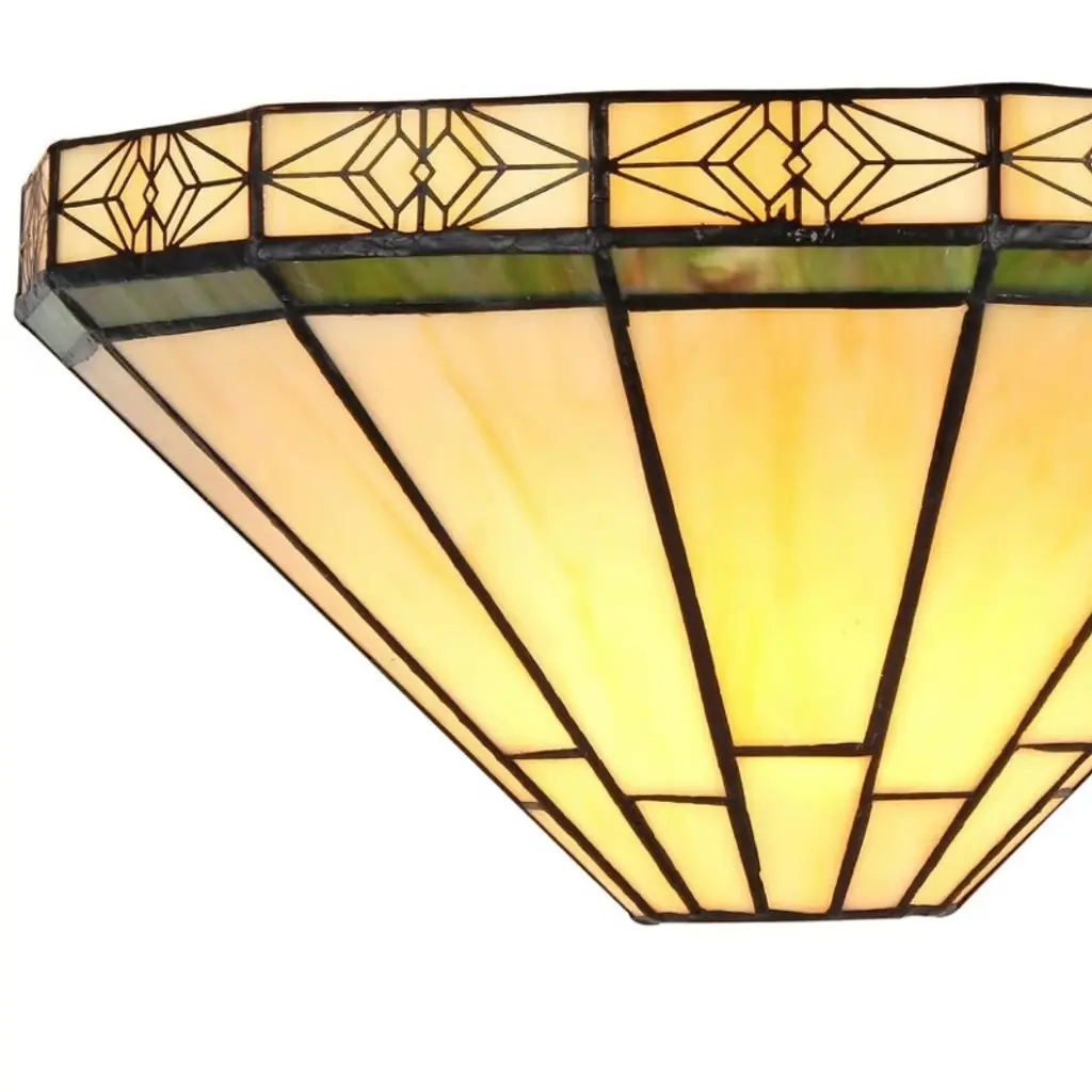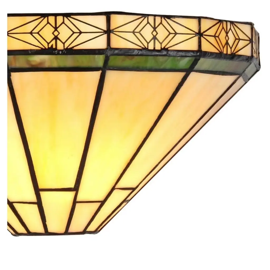 The Belle 1-light wall sconce blends classic Tiffany artistry with Mission-style geometry to create an elegant indoor lighting accent. Crafted from individually hand-cut pieces of beige and green stained art glass, this handcrafted sconce features a textured black finish that enhances its visual appeal. Its warm glow and semi-circular design offer the perfect blend of form and function for hallways, entryways, or bedroom walls. Key Features: Classic Mission design with handcrafted Tiffany-style stained glass Textured black finish provides contrast and sophistication Requires (1) 60W E26 Type A bulb (not included) for warm downlighting Hardwired wall switch operation for seamless integration Dimensions: 6.1"H x 12.4"W x 6.5"D | Net Weight: 2 lbs