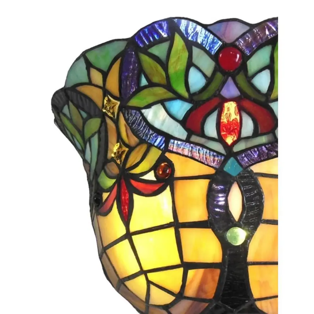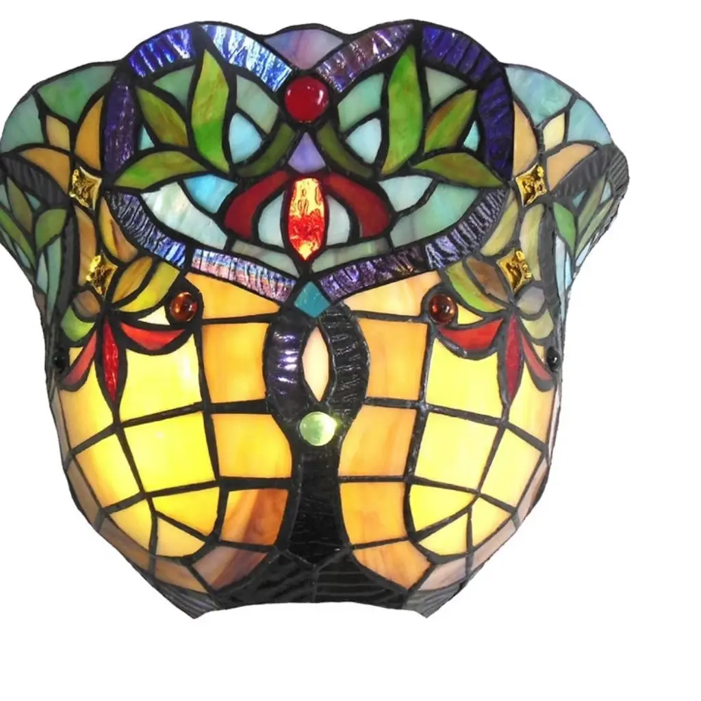 Elevate your interior with the timeless charm of the Bertram Tiffany-style Victorian wall sconce. Handcrafted from 181 pieces of richly colored stained glass, 10 decorative beads, and dazzling crystal accents, this bowl-shaped uplight creates a warm, romantic glow. Finished in a dark antique bronze patina, its classic beauty enhances hallways, bedrooms, or reading nooks with vintage elegance and artistic detail. Key Features: Handcrafted Tiffany-glass sconce in a classic Victorian bowl design Dark antique bronze finish complements traditional or eclectic interiors Requires (1) 60W max E26 Type A bulb (not included) Constructed from 181 hand-cut glass pieces, 10 beads, and crystal accents Dimensions: 12" H x 8" W x 6" Projection | Net Weight: 3.8 lbs