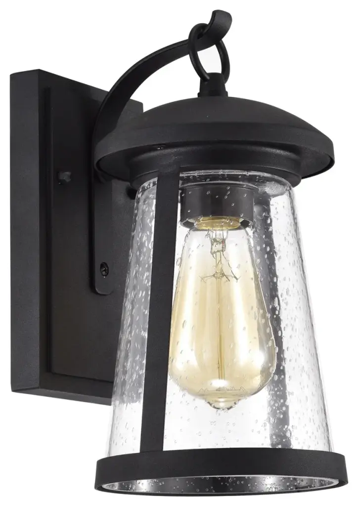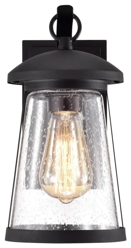 Freya is a traditional, transitional style 11 inch tall outdoor wall sconce, and it is calling your name This sconce features a beautiful, bell shaped, clear seedy glass, encapsulating a sleek vintage edison bulb. The steel frame is in a textured black finish. The fixture takes one 100W E26 bulb and is compatible with incandescent, flourescent, and LED bulbs. Also, the open shade make light bulb changes a breeze. All of our outdoor wall sconces are UL listed, and dry, damp and wet listed, to survive all weather conditions, hot and cold. Also, this sconce is recommended for both residential and non-residential use