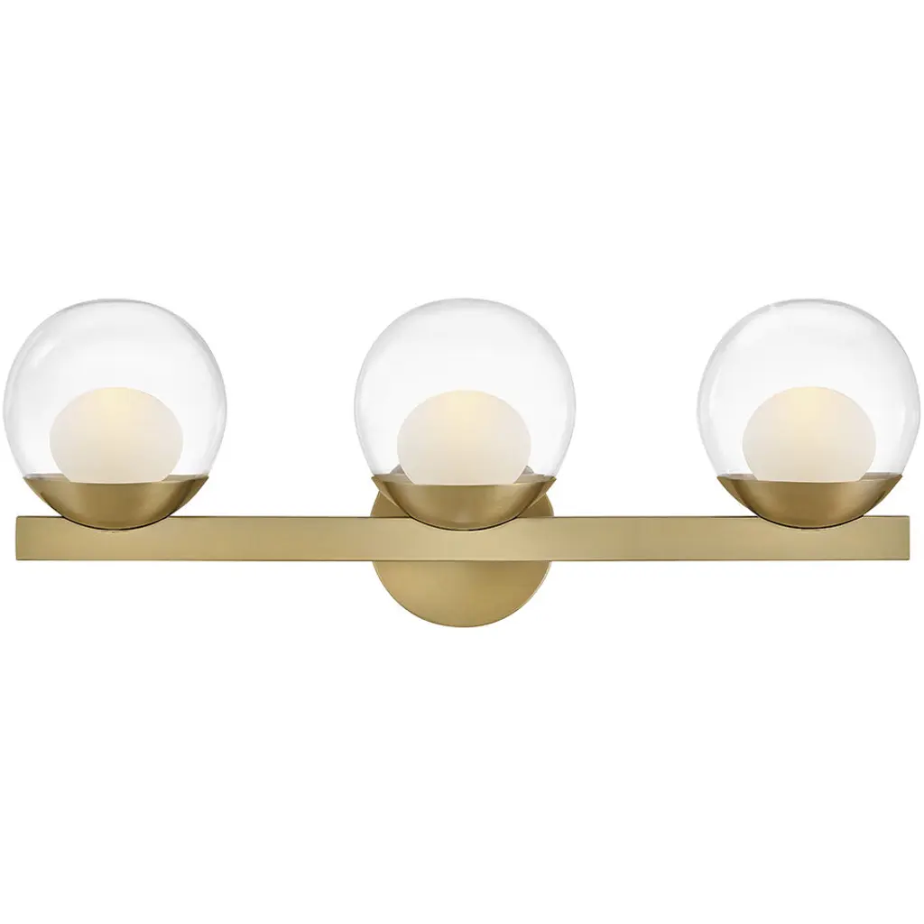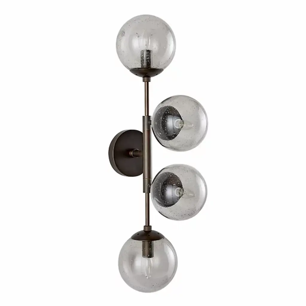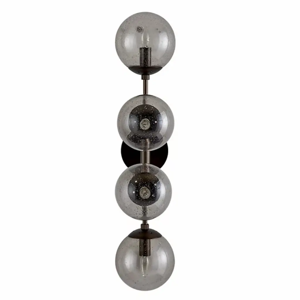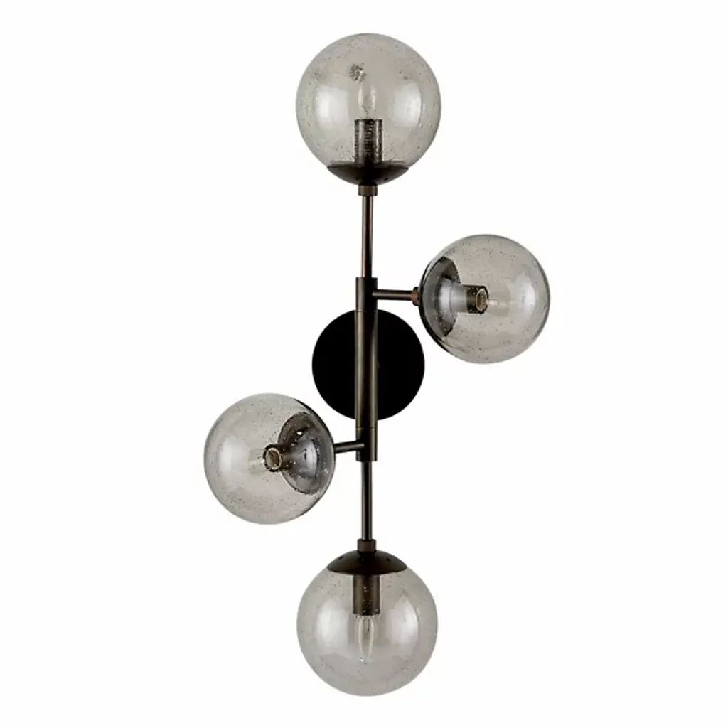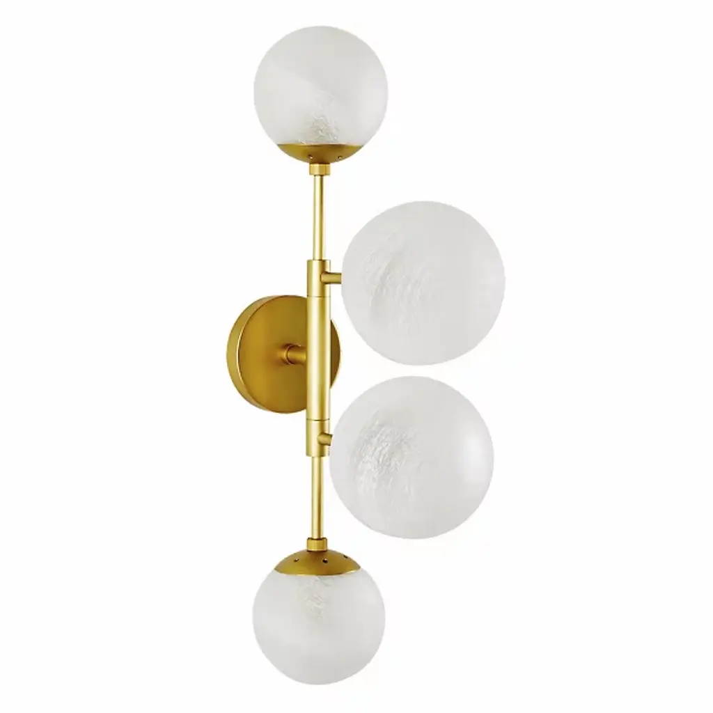 The Christelle Wall Sconce from Arteriors, reminiscent of celestial bodies, features a quartet of glass globes orbiting an axis of antique brass-plated steel. Its articulated arms enable easy rotation, creating a striking mirrored effect. This versatile design can be mounted horizontally or vertically, making a bold statement whether displayed alone or in multiples. With a finish that varies, each piece is unique, ensuring an impactful and distinctive addition to any space.
