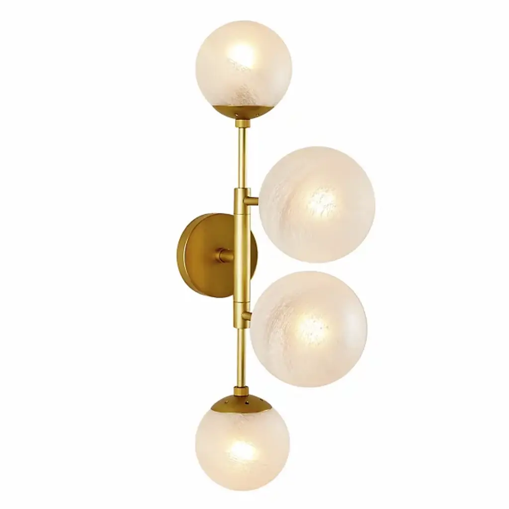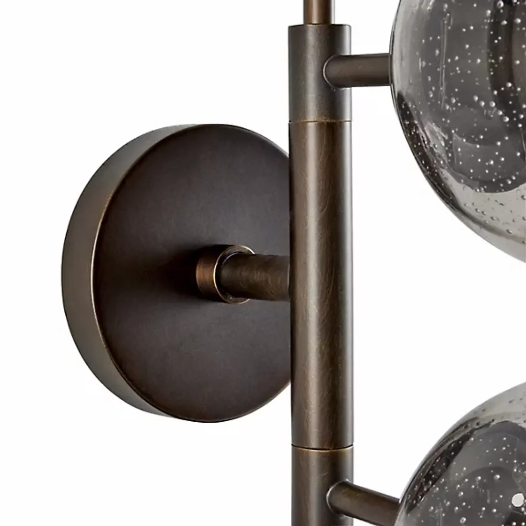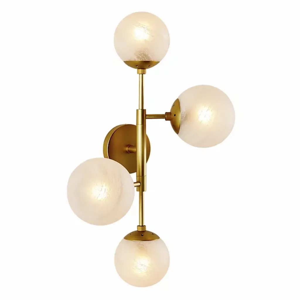 The Christelle Wall Sconce from Arteriors, reminiscent of celestial bodies, features a quartet of glass globes orbiting an axis of antique brass-plated steel. Its articulated arms enable easy rotation, creating a striking mirrored effect. This versatile design can be mounted horizontally or vertically, making a bold statement whether displayed alone or in multiples. With a finish that varies, each piece is unique, ensuring an impactful and distinctive addition to any space.
