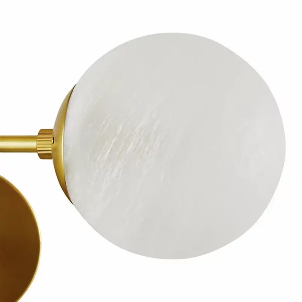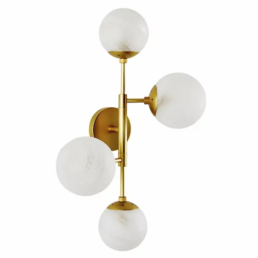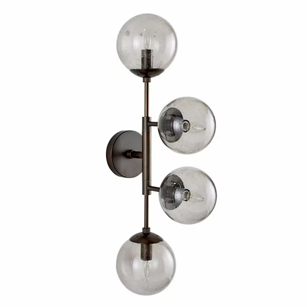 The Christelle Wall Sconce from Arteriors, reminiscent of celestial bodies, features a quartet of glass globes orbiting an axis of antique brass-plated steel. Its articulated arms enable easy rotation, creating a striking mirrored effect. This versatile design can be mounted horizontally or vertically, making a bold statement whether displayed alone or in multiples. With a finish that varies, each piece is unique, ensuring an impactful and distinctive addition to any space.