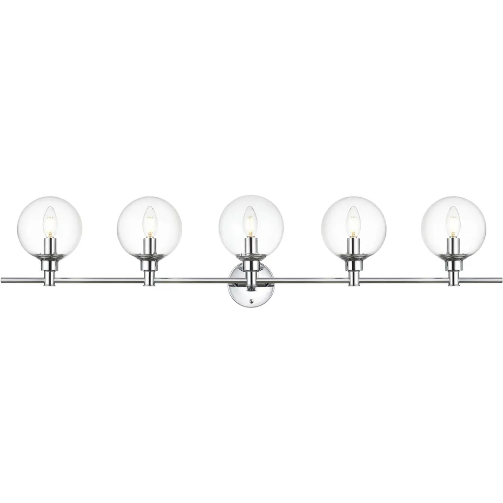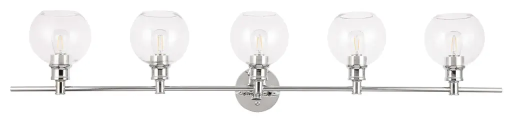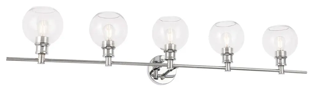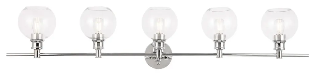 Elevate the contemporary style of your home with this midcentury modern wall sconce in a chrome finish. The 5-lights within the spherical clear glass shades will create an illuminating spotlight, and its minimalistic clean-line style will subtly complement your room with sleek elegance--its versatile beauty seen in your choice of orienting the light facing up or down. Let this wall sconce shine in your home singularly or in a pair whether it''s in your hallways, bathroom, or powder room.Clean sleek lines and a minimalistic design that is a versatile fit for any aestheticHardware finish in chromeClear glass ball shaped shade5 lights that illuminate down or upwards ; dimmableFixture material: iron and glasseasily mounted on wallLight bulb type: LED E26 (not included)