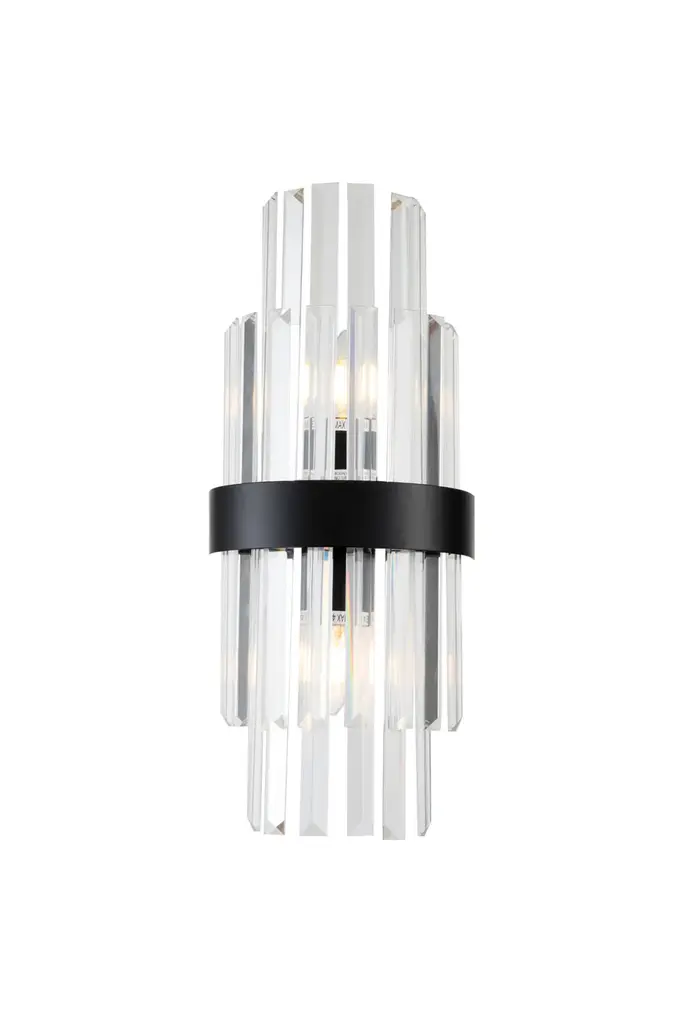 A chrome metal band frame wall sconce with clear glass rods Color: ChromeSize: L8.6" H23" D5"Materials: Glass & Stainless SteelLighting Specs:Commercial Use: YesUL Certified: YesETL Certification: NoLight bulbs not includedNumber of Bulbs: 3Bulb Type: E12Max Wattage: 40