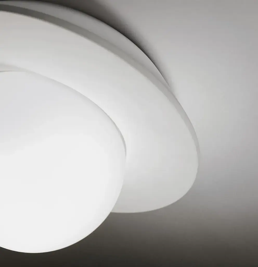 Cicladi Tonda is a wall/ceiling lamp made of plaster with a blown round glass. Equipped with a GX53 socket.