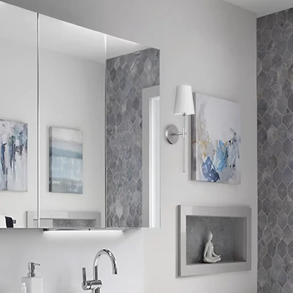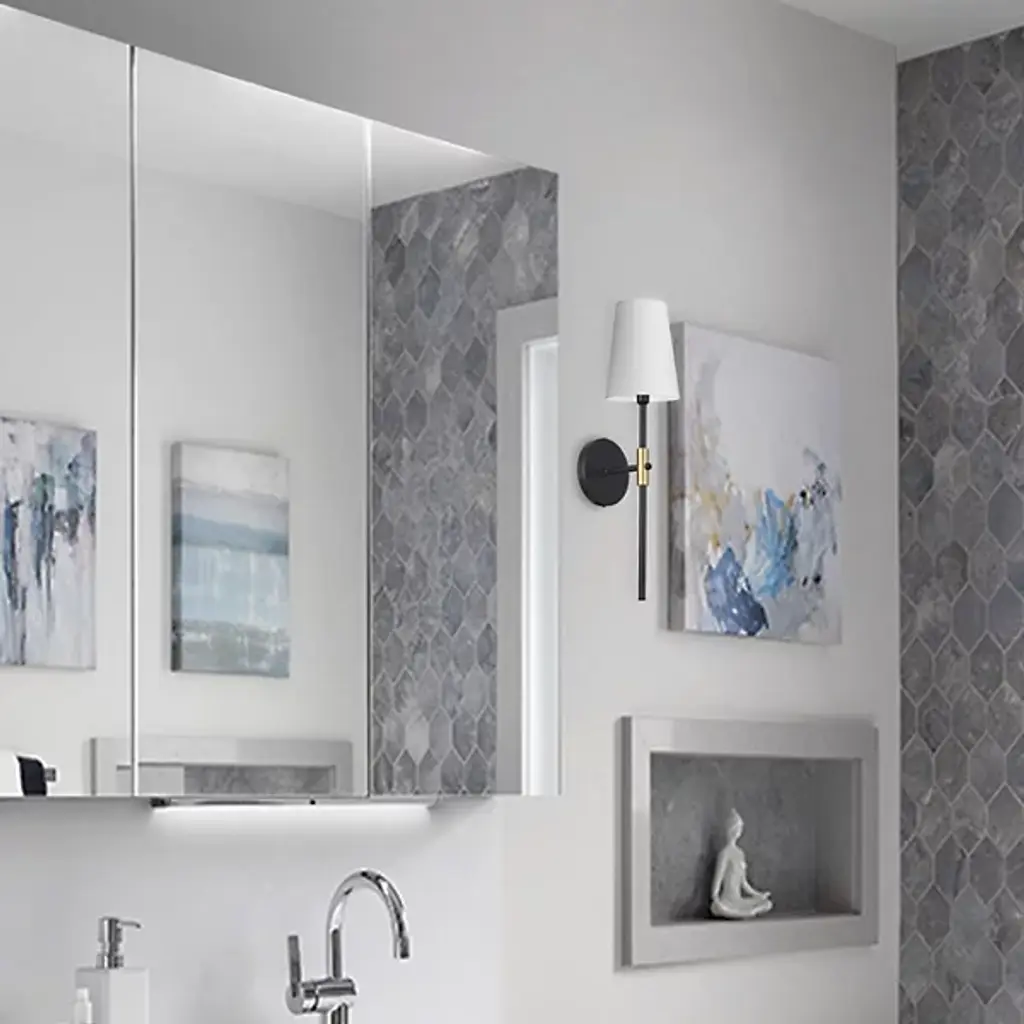 The Cinthia Wall Sconce with Shade by Dainolite is an exceptional choice for any room, but it particularly shines in bathrooms, powder rooms, and spas. Its transitional style seamlessly blends classic charm with contemporary design, offering a sophisticated loft in any space. This unique wall sconce is crafted from durable metal and features a tapered drum shade made from elegant fabric.. This wall sconce adds visual interest and creative lighting solutions to a room.
