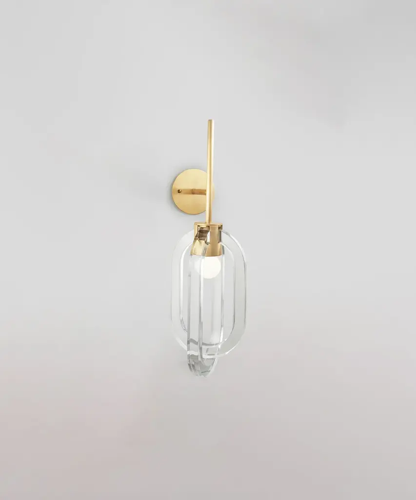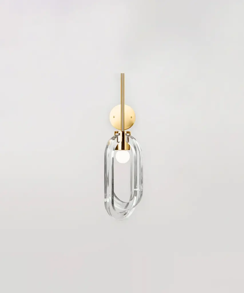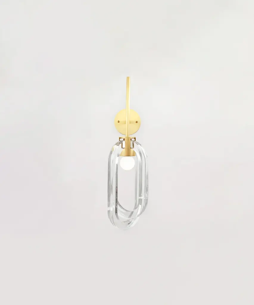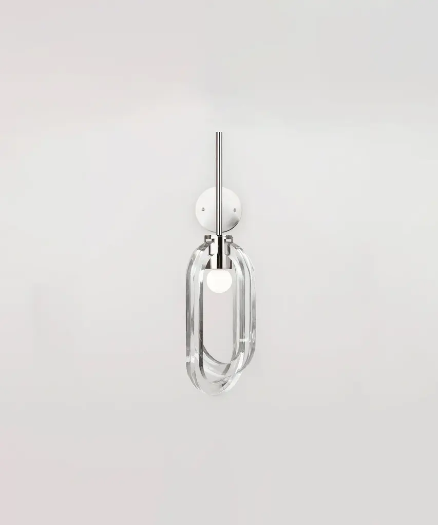 Cast-resin rings, one looping under the next create a spiraling, illuminated choreography. The resin rings are designed to evoke bubble-filled glass while offering the strength and durability of resin. The inside facing of each ring is fogged, allowing the light to carry through the entirety of the ring's loop. The fixture is available in a variety of metal finishes. Each piece is designed and hand-produced by Coil + Drift, a lauded New York's Catskill Mountains-based design studio known for its vividly three-dimensional and material-forward collections.