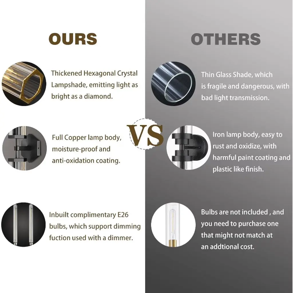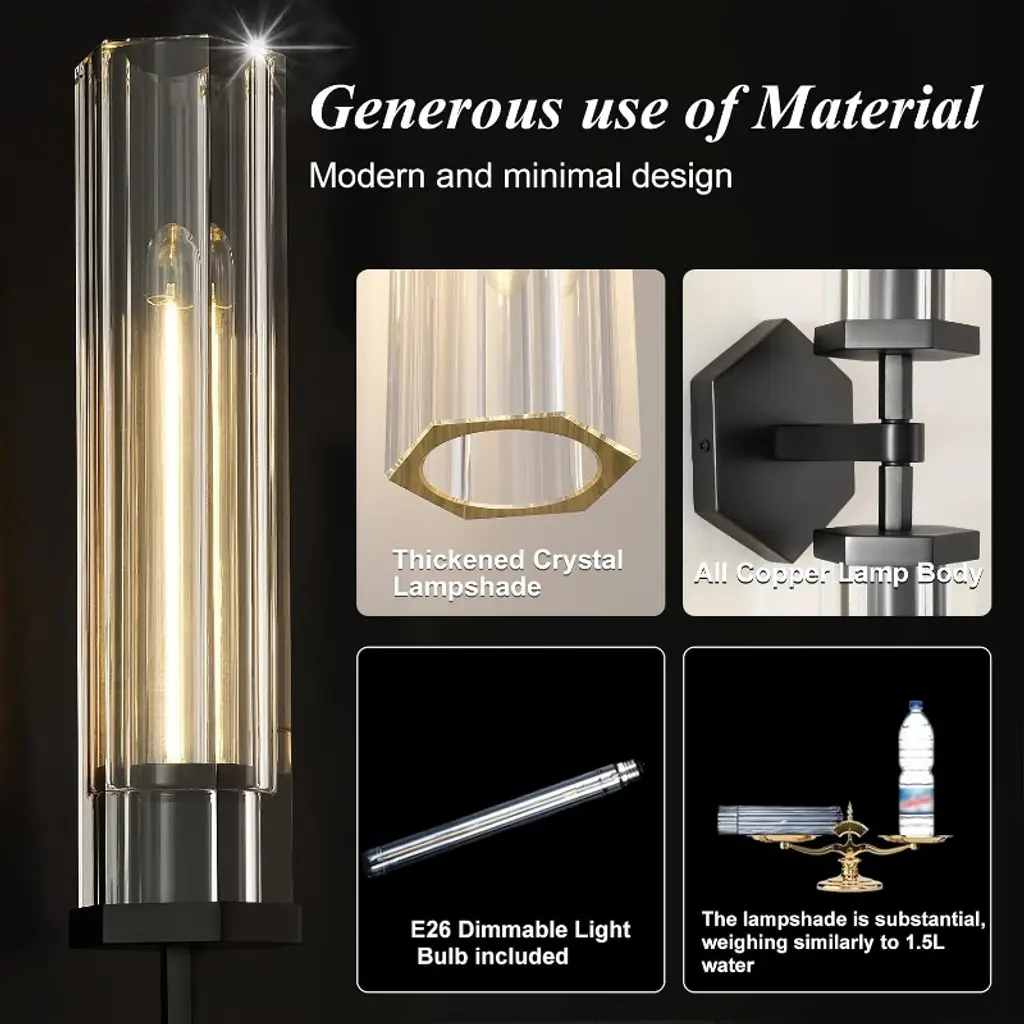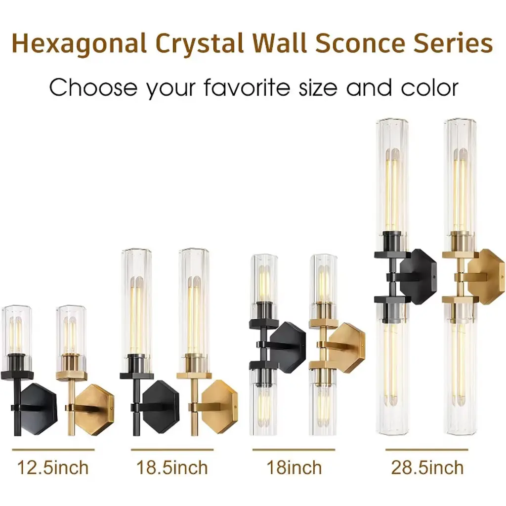 This wall sconce adds a beautiful look to your bedroom or bathroom with its clean lines and classic finish. Featuring unique hexagonal crystal glass shades with a matte black finish, this wall light adds a modern yet luxurious touch. When the lighting is turned on, the shimmering K9 clear crystal glass emits a gorgeous and bright light. The sconce can be mounted vertically or horizontally, the perfect complement for the bathroom, bedroom, dining room, hallway, stairway or any space.