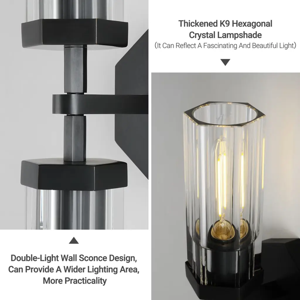 This wall sconce features two hexagonal crystal shades that hold a copper backplate in a matte black finish for a simple and clean look. The speaking K9 crystal shade emits a dazzling light, creating a warm and cozy ambiance. With its simple and elegant look, this wall light is perfect for bathrooms, bedrooms, kitchens, hallways, laundry rooms, and living rooms.