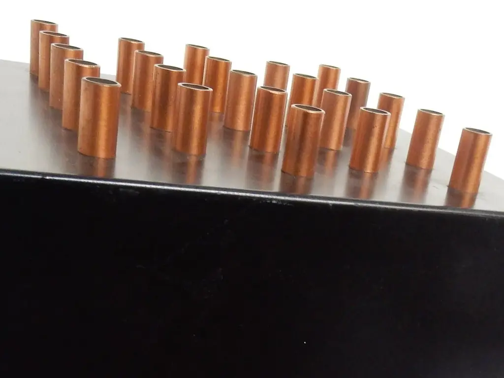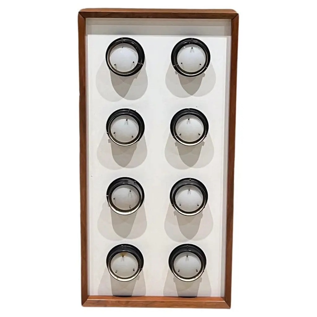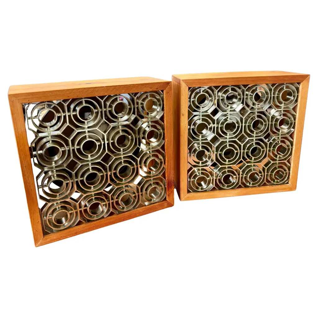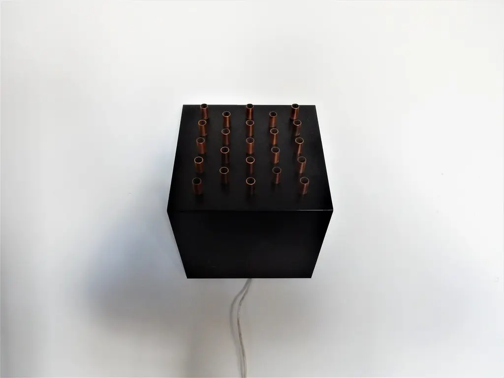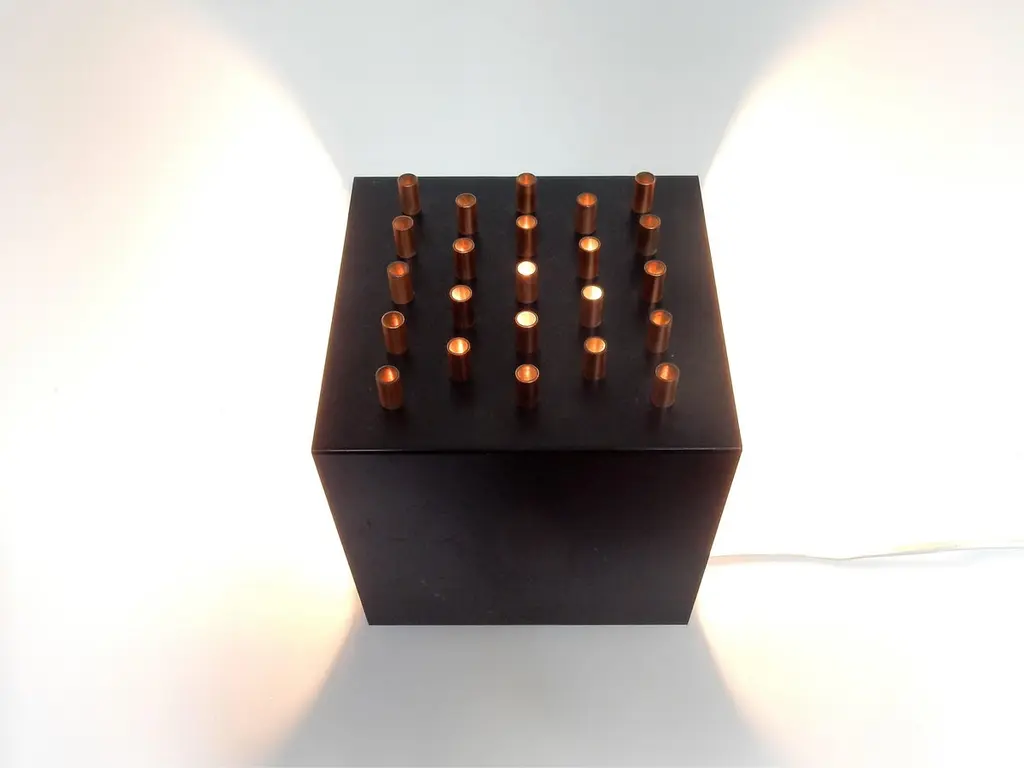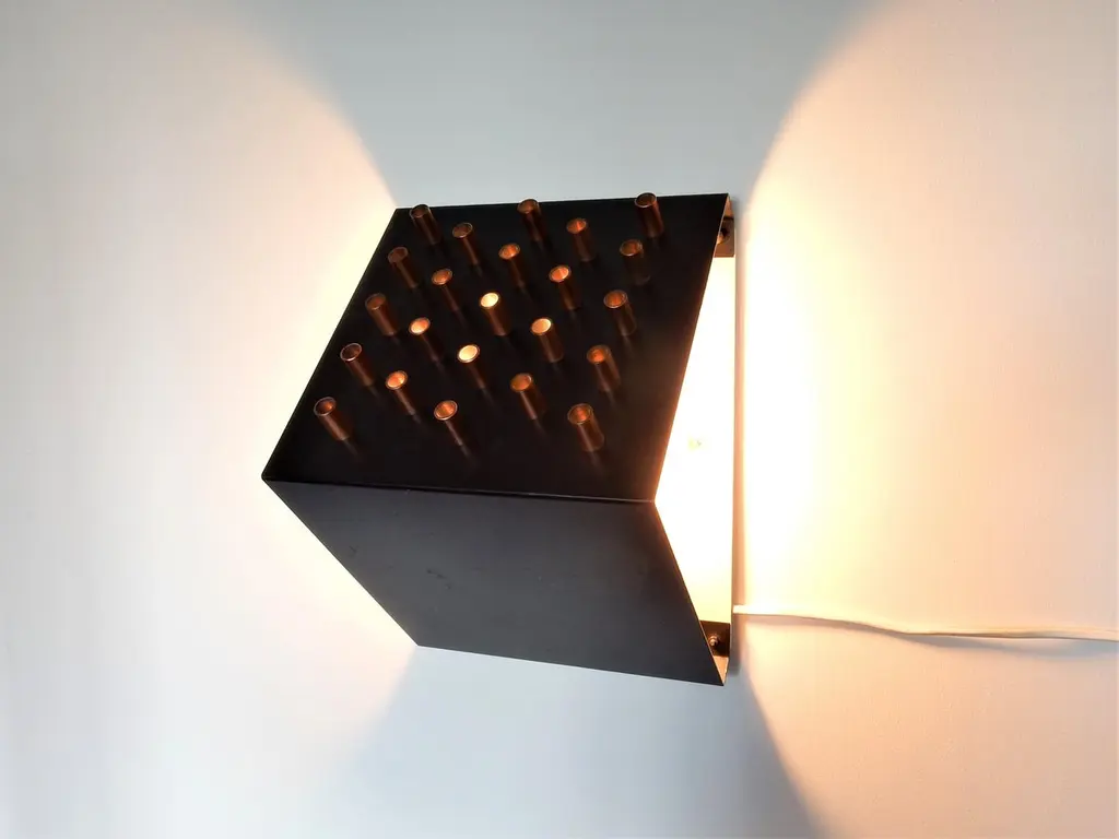 This very decorative wall lamp was designed and made by RAAK in the 1960s. It is made of black sheet metal that has copper tubes at one side for a stunning light effect. Also the top and bottom are open for a clear upward and downward light, or if positioned differently a sideways light. A combination of 'clair' and 'obscur' illumination, a beautiful design! We have 9 of these lamps available from various sources, all in a good condition with various signs of age and use. 6 lamps have a white wall plate and 3 have a black wall plate.