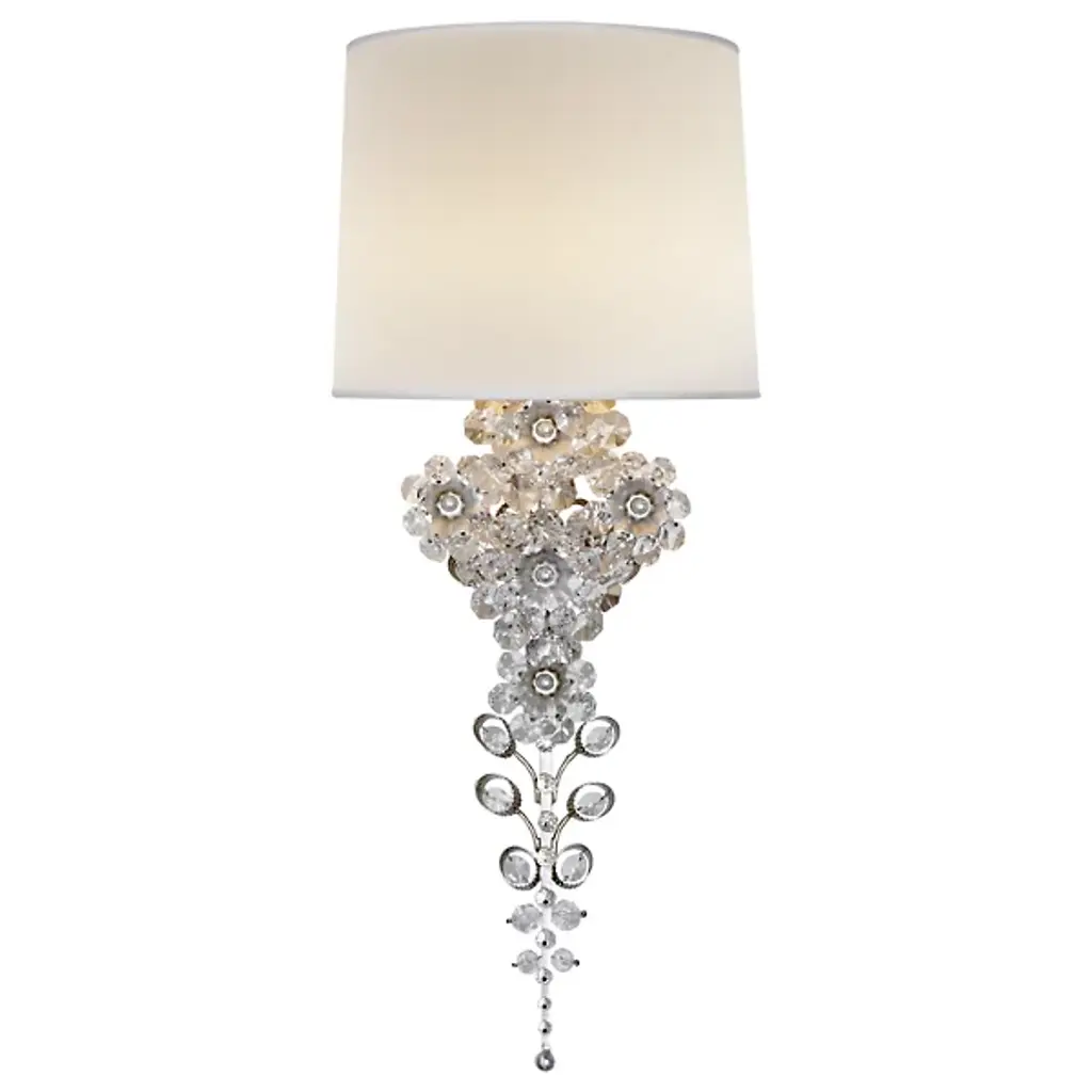 Lively and elaborate like a hand-cut bouquet of flowers. The Claret Wall Sconce from Visual Comfort Signature, formerly known as Visual Comfort, provides animated energy to the home, leaving a trail of warm, ornate light. This sensory piece carries the attention to detail of traditional décor. It rests on a low-profile backplate for versatile mounting. Faceted glass beads are arranged to create blooming floral compositions. The glass beads taper off below to create a beautiful, bedazzled tail. A tapered drum shade on top covers the lamping with a milky hue. While filtering out a soft light, the drum points light towards the glass beads for a festive show of highlights.