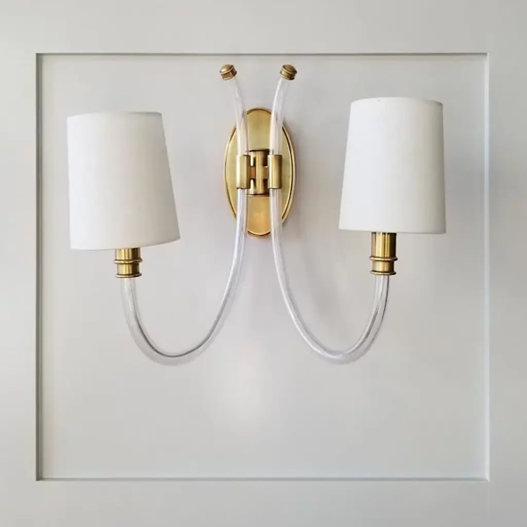 A clear perspective on style. Sporting transparent armatures to support its twin luminaires, the Clarice 2-Light Wall Sconce by Visual Comfort Signature, formerly known as Visual Comfort, evokes the acrylic chic trends of the 1960s, '70s and '80s. Its handsome wall plate and classic linen shades, meanwhile, lend a contrasting aspect of tradition to create a balanced aesthetic fit for any interior design.