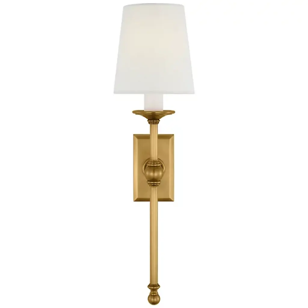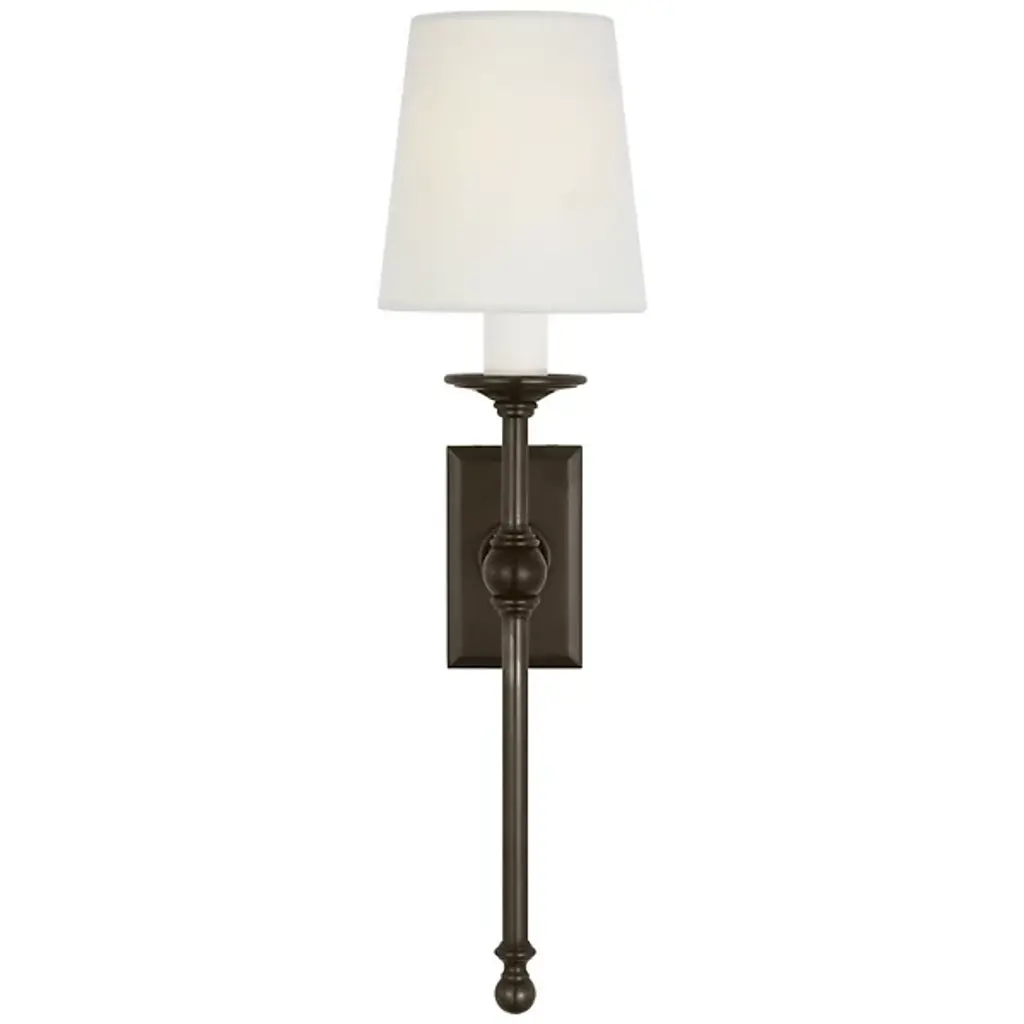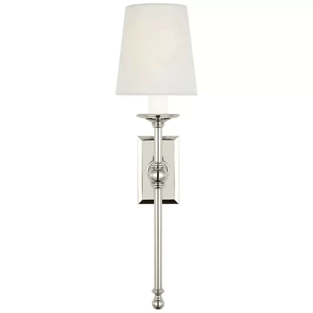 The Classic Tail Wall Sconce from Visual Comfort Signature is a refined light fixture designed by Chapman & Myers. Crafted from high-quality metal, this wall sconce exudes durability. Its regal, streamlined design is complemented by a linen shade, adding texture and functionality. A globe embellishment draws your eye and gives the fixture an architectural look. Paired with the bobeche detail, this sconce exudes timeless charm and elegance. Its LED’s brightness is adjustable when paired with a separately sold ELV dimmer.