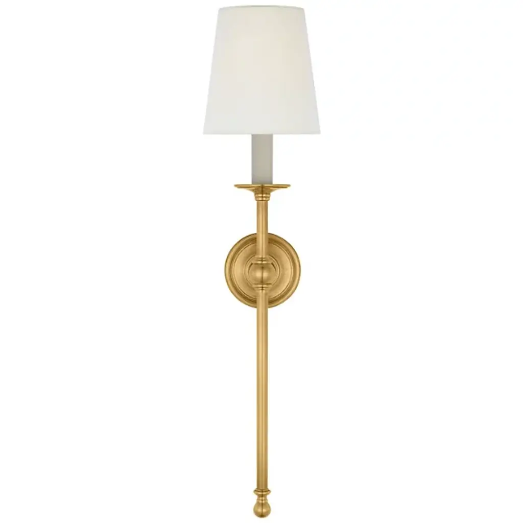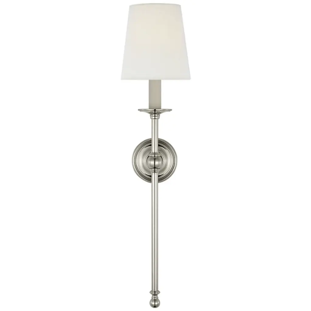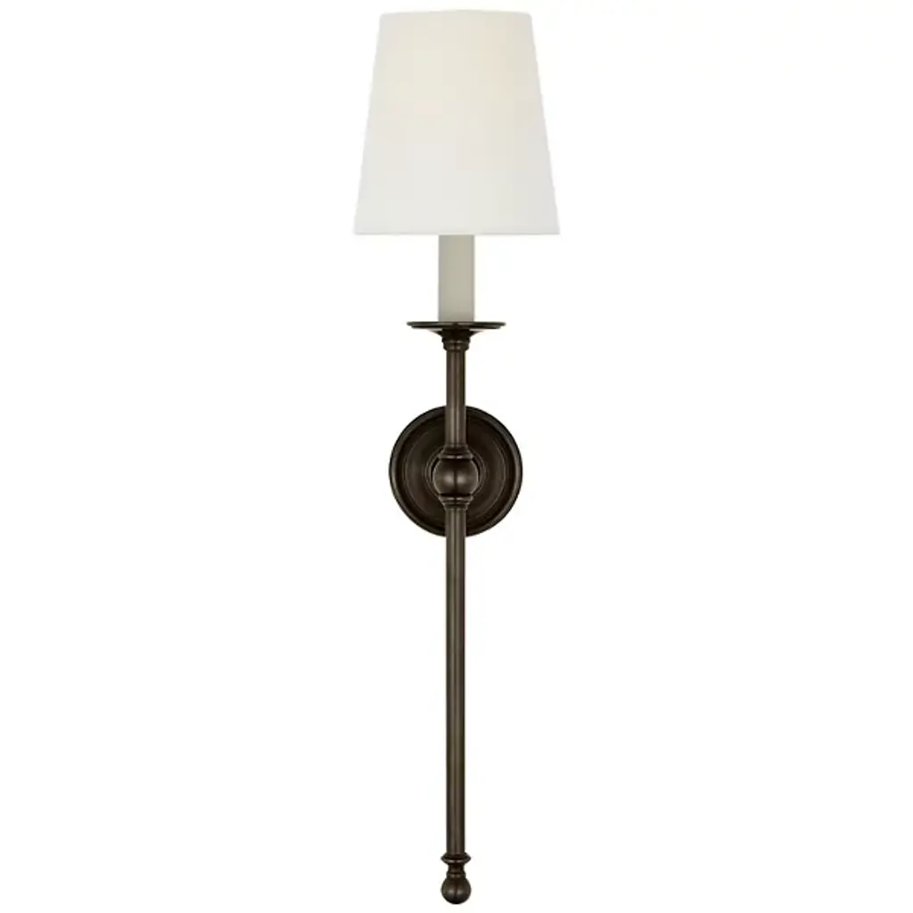 The Classic Tail Wall Sconce from Visual Comfort Signature is a refined light fixture designed by Chapman & Myers. Crafted from high-quality metal, this wall sconce exudes durability. Its regal, streamlined design is complemented by a linen shade, adding texture and functionality. A globe embellishment draws your eye and gives the fixture an architectural look. Paired with the bobeche detail, this sconce exudes timeless charm and elegance. Its LED’s brightness is adjustable when paired with a separately sold ELV dimmer.