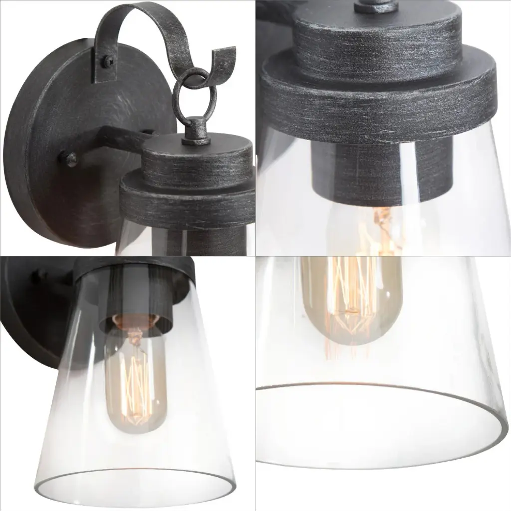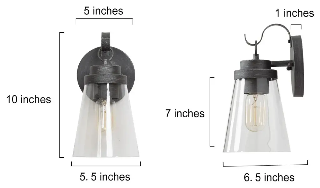 Mini funnel flared clear glass lampshade adopts the traditional hand blowing glass industry technology, interior with some bubble, reflect the perfect glass art style. Bring country industrial flair to your outdoor spaces with this rustic metallic wall light.Simple and stylish, create a retro, romantic atmosphere for your family, loved ones and friends.E26 base, you can choose your favorite bulb 60W max.The bulb is sold separately.Size:L 5.5"x W 6.5"x H 10"Material: Iron+GlassFinish:Sand grain blackUL Safety Rated: WETBulb : Type B, E12, Max 40W(Bulb not include)Lights Qty: 1Round Canopy Size: 5"Chain: Adjustable, 1"-59"