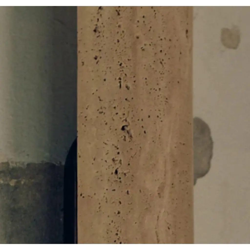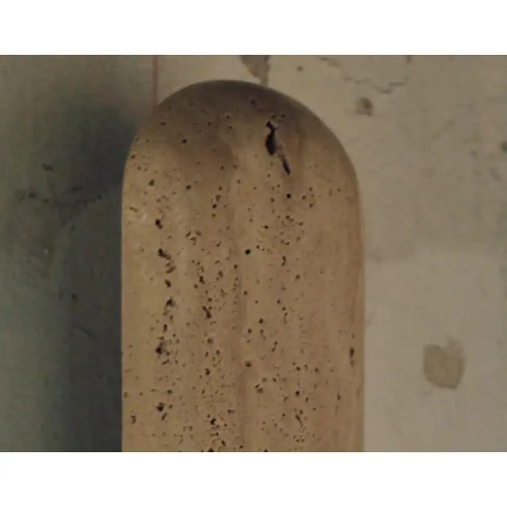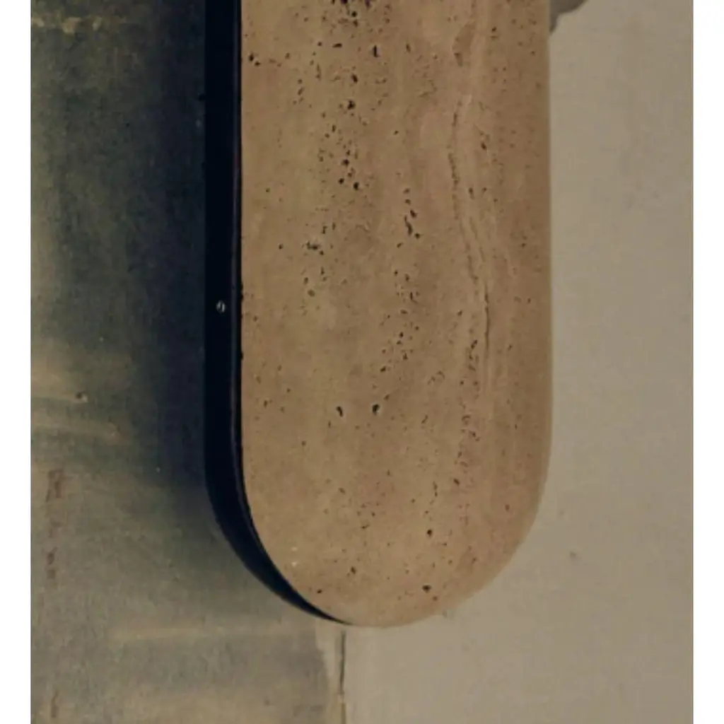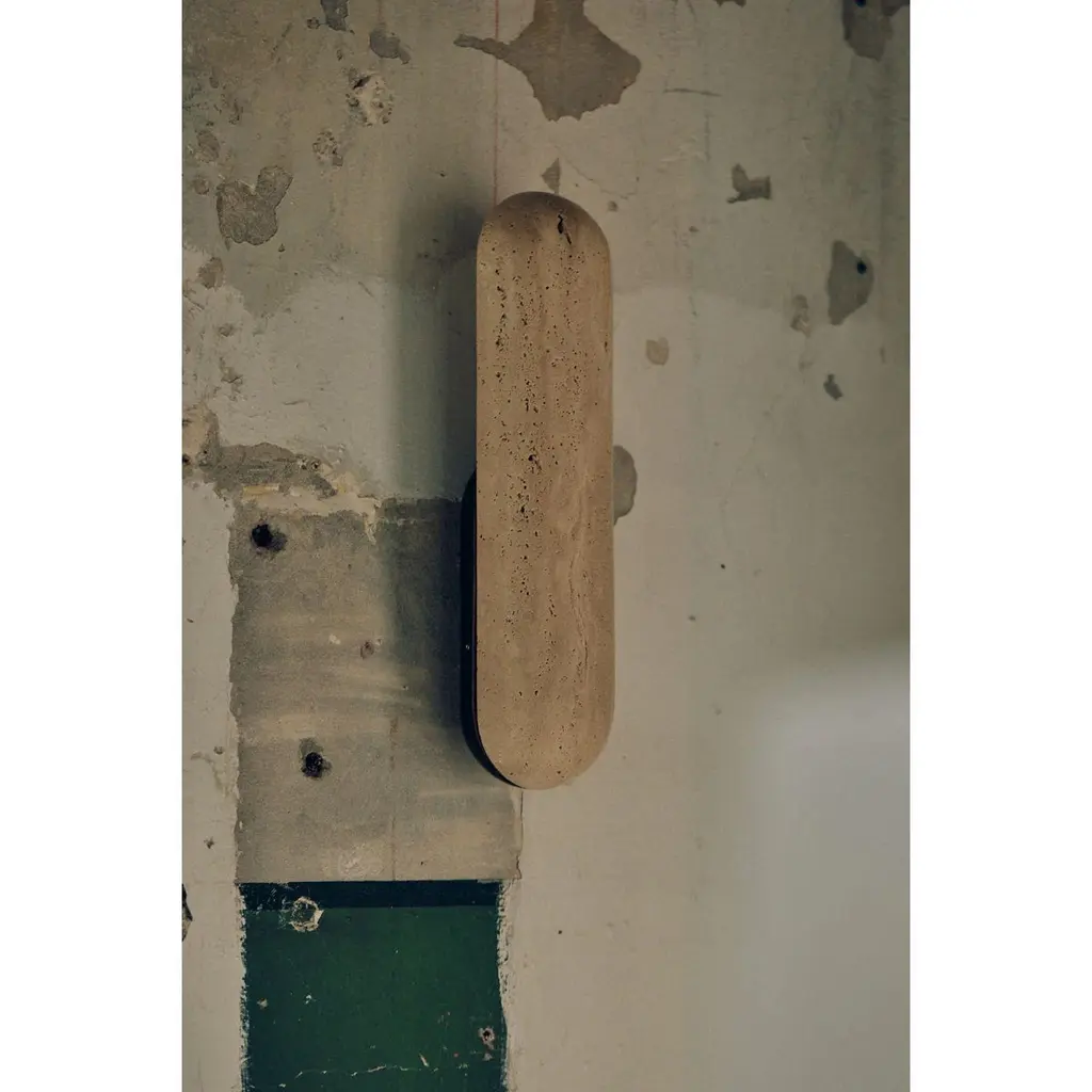 Classico Travertine Pill Sconce by Henry WilsonDimensions: W 10 x D 10 x H 40 cmMaterials: Travertine Sandwiched between two components, the light source is projected onto the concave backing. The light follows the gentle bowl of the dish and is directed outward, reflecting a warm glow of light onto the opposing surface. The blackened bronze mounting element is sand cast and rumbled to a polished finish, in Sydney Australia. Sculptural both in use and when switched off. The weight of the light requires a strong mounting location.All our lamps can be wired according to each country. If sold to the USA it will be wired for the USA for instance.Henry Wilson's work combines a rational, democratic utility with an element of sculptural expression. There is a clear form and function in our products, but it’s important they also have feeling. We are interested in the awkward beauty that comes from something made by hand. We like to explore how imperfection can be introduced into an Industrial process, to make something at scale that retains a sense of individual charm.