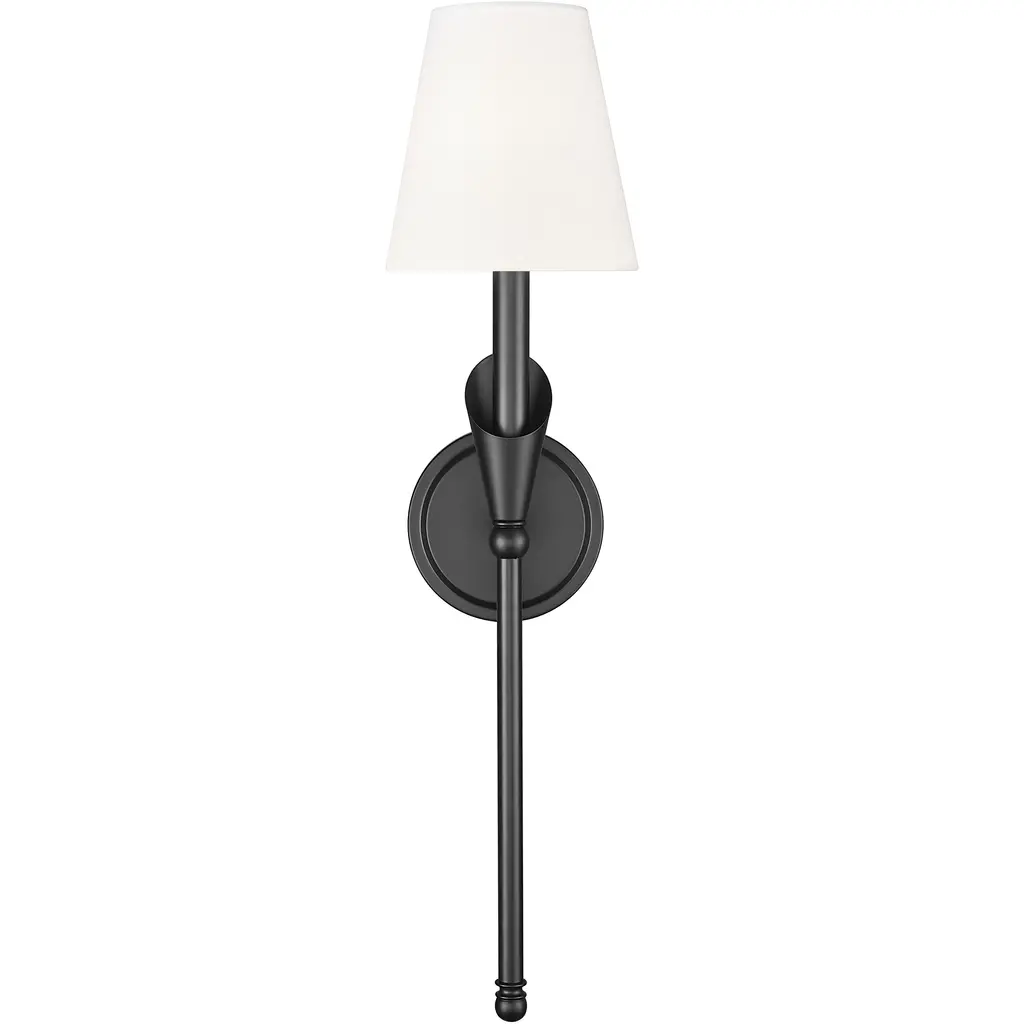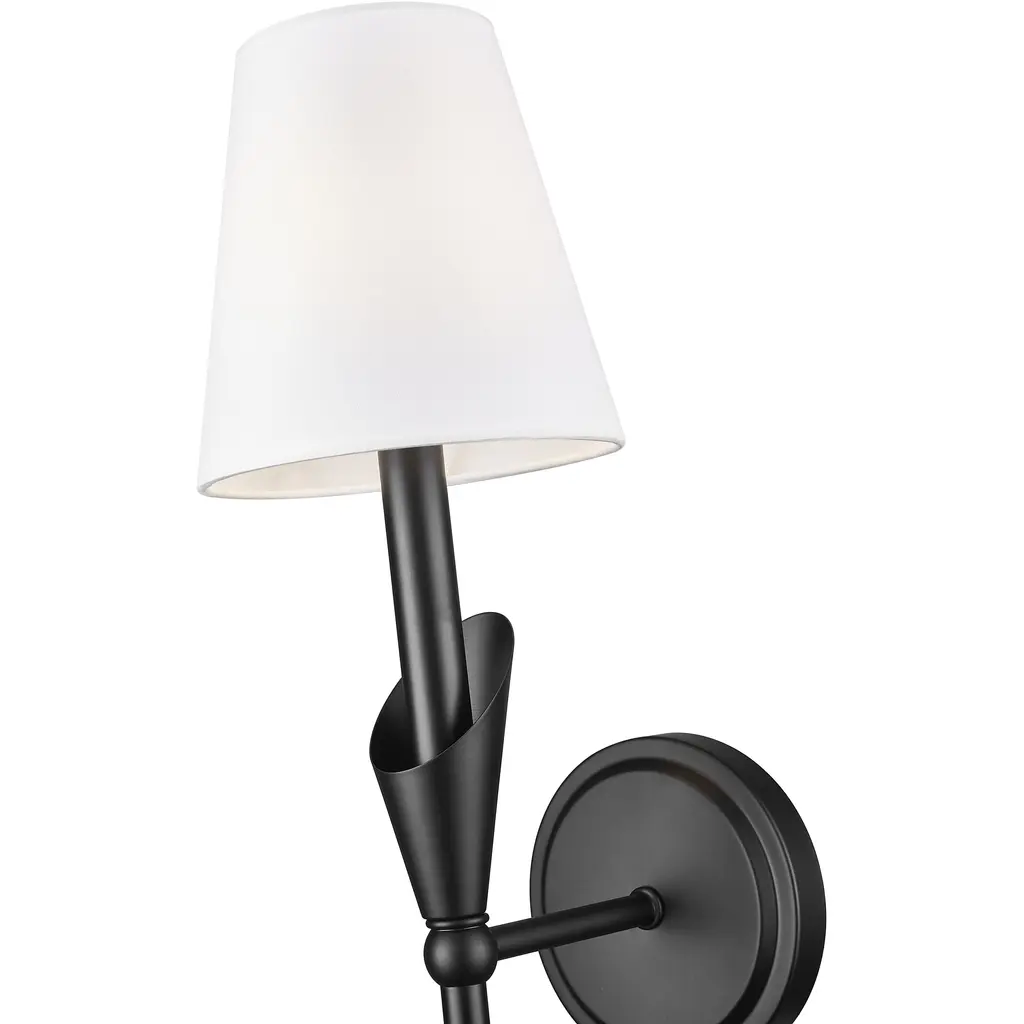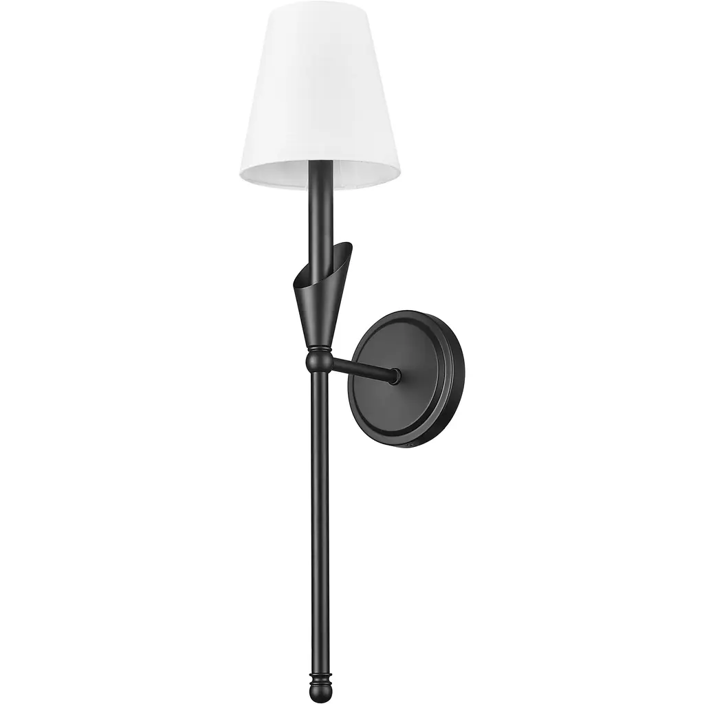 Inspired by the fluid grace of a calla lily, this wall sconce captures movement and elegance in a single, sweeping gesture. Its slender matte black arm curves gently beneath a white fabric shade, adding softness to its modern form. Perfect for bedrooms, hallways, or cozy reading corners, it delivers a timeless touch with a contemporary edge.