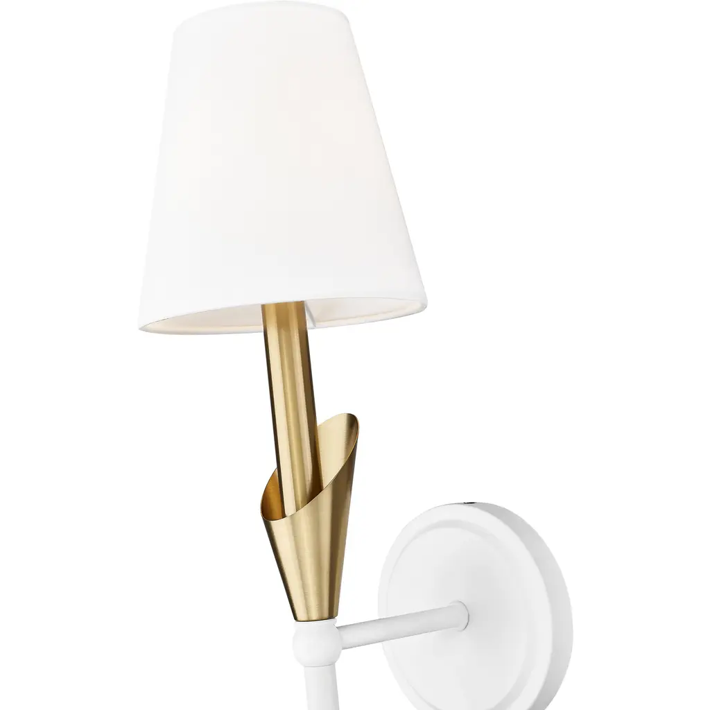 Inspired by nature and elevated with contrast, this sconce is a graceful balance of form and finish. The textured white frame curves with organic ease beneath a modern gold accent, echoing the lines of a calla lily. Topped with a soft white fabric shade, it brings sculptural beauty and warmth to any wall it touches.
