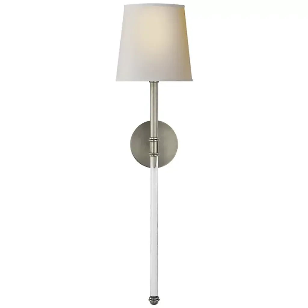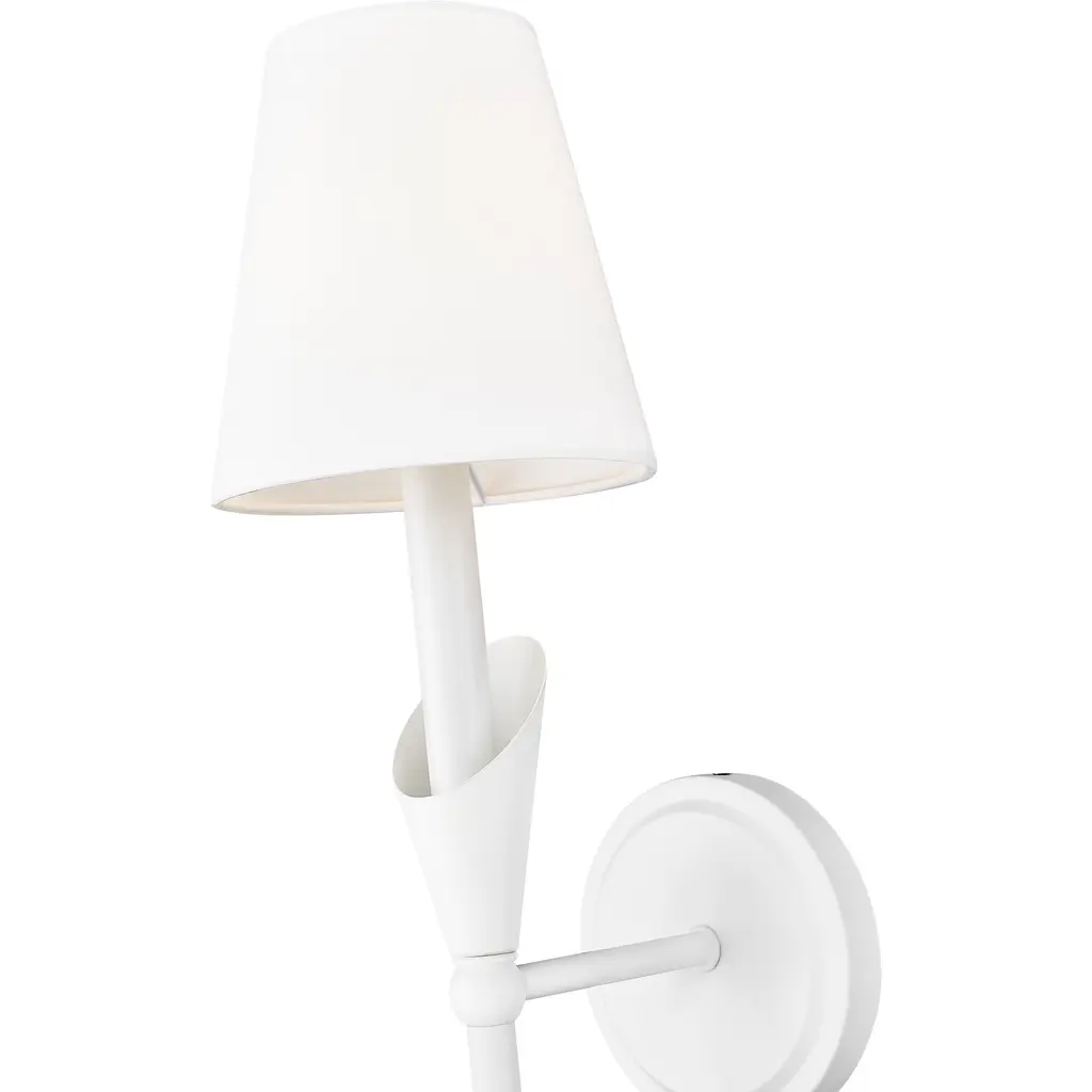 Delicate in design yet striking in presence, this sconce adds a sculptural softness to the wall. The textured white finish offers a clean, airy feel, while the curved arm and fabric shade mimic the gentle arc of a bloom. Its a versatile accent that freshens up any room with subtle elegance and a light designer touch.
