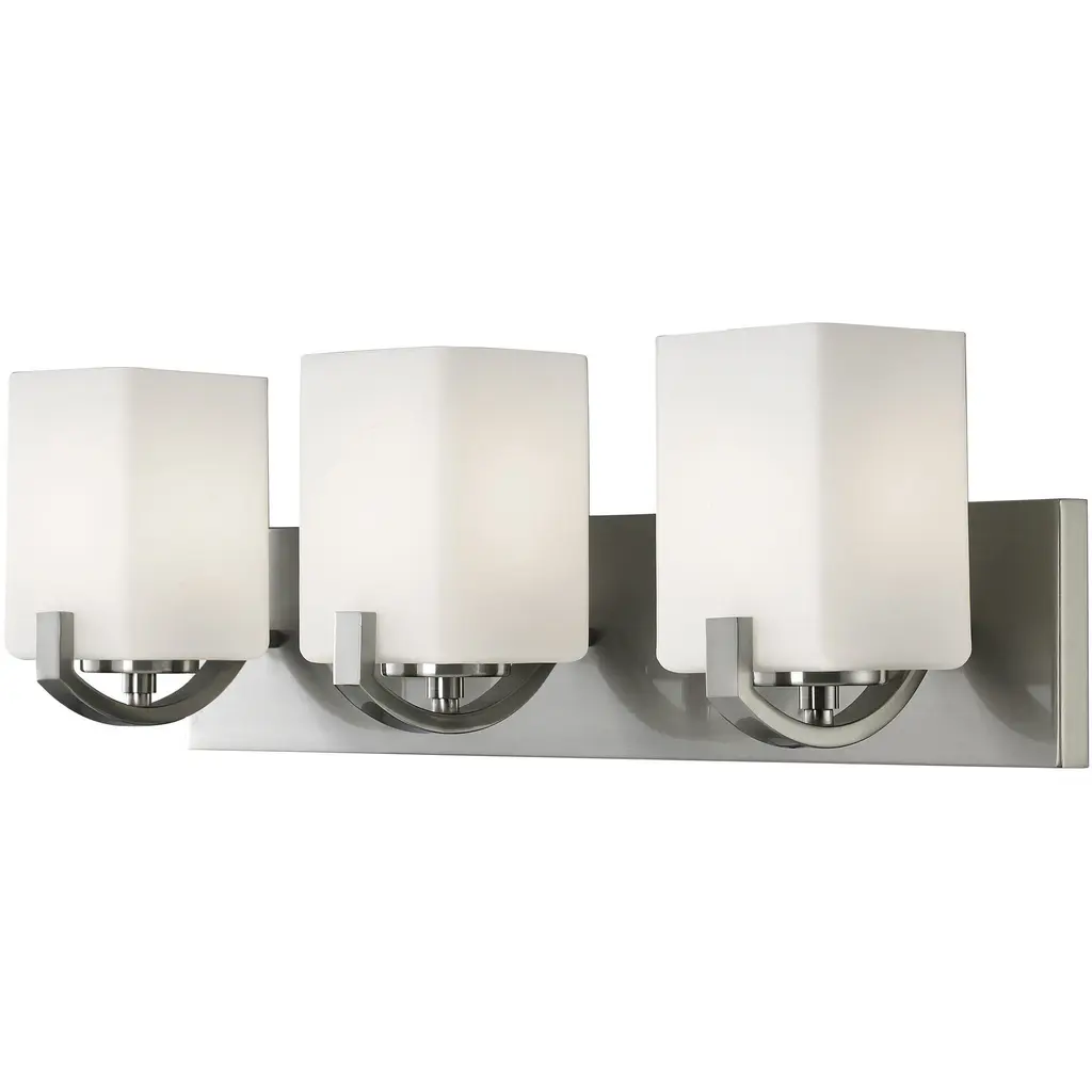 INNOVATIONS 427-3W-SN-G427-14WH Claverack 3 21.75 inch Bath Vanity Light Satin Nickel. Style: Art Deco, Art Nouveau. Collection Name: Downtown Urban. Metal Finish(Body): Satin Nickel. Material: Steel, Cast Brass, Glass. Dimension(in): 16.625(H) x 21.75(W) x 7.5(Ext). Bulb: (3)5W LED(Included). Voltage: 120. Dimmable: Yes. Color Temperature (Kelvin): 2700. Color Rendering Index (CRI): 90. Lumens: 500. Life Expectancy (Hours): 15000. Glass Shade Description: White Claverack. Glass Type: Frosted. Shade Shape: Geometric. Glass or Metal Shade Color: White. Shade Material: Glass. Shade Dimension(in): 4.75(W) x 13.25(H). ADA Compliant: No. California Proposition 65 Warning Required: Yes. UL/ETL Certification Type: Damp Location.