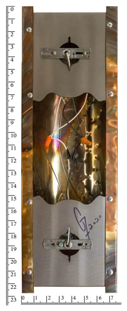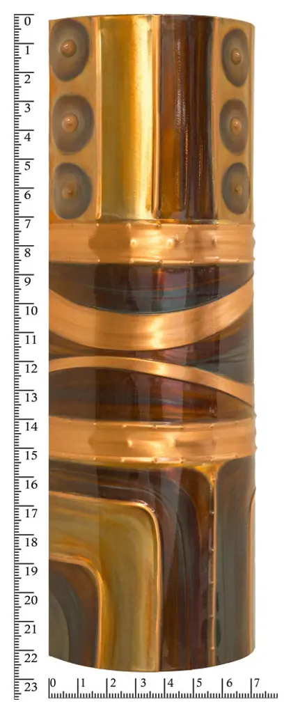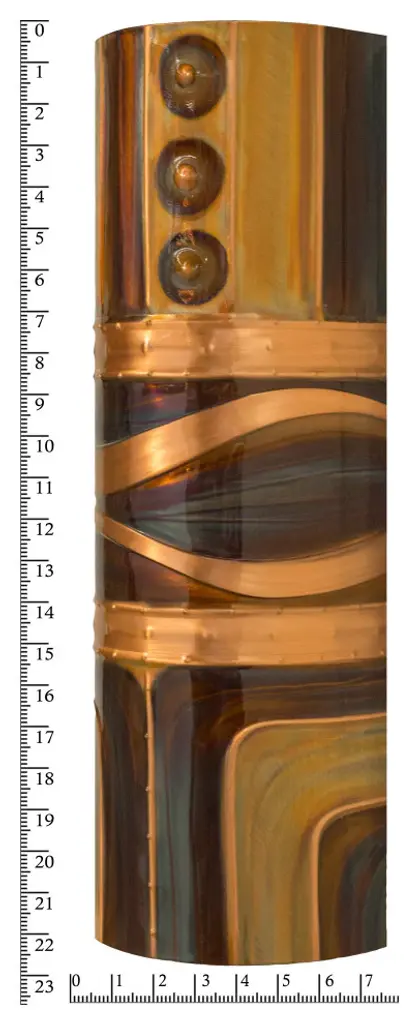 This lighting sconce is a hand rolled copper half pipe wall hanging, created by Greg Gowen of New Mexico. It is an illuminated sculpture made with bead rolled relief designs and torch flame painting techniques applied to release a variety of colors stored within the copper. Finished with a powder coating to protect the piece, this piece is often displayed in pairs flanking either side of a doorway, window, or your favorite painting. This fixture is for an indoor or outdoor setting. Included is a plastic capping so the sconce can be hung outdoors.