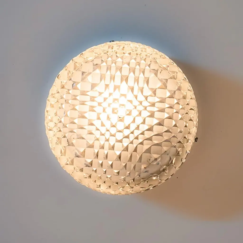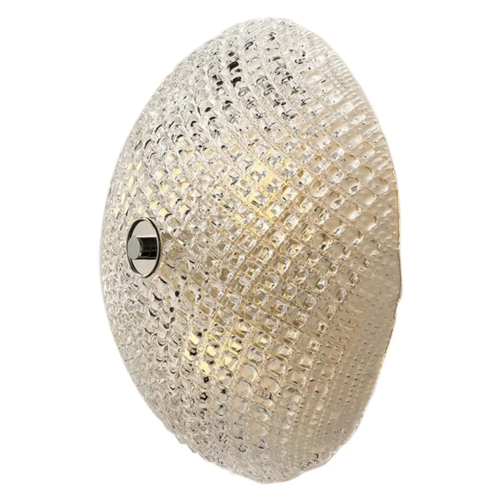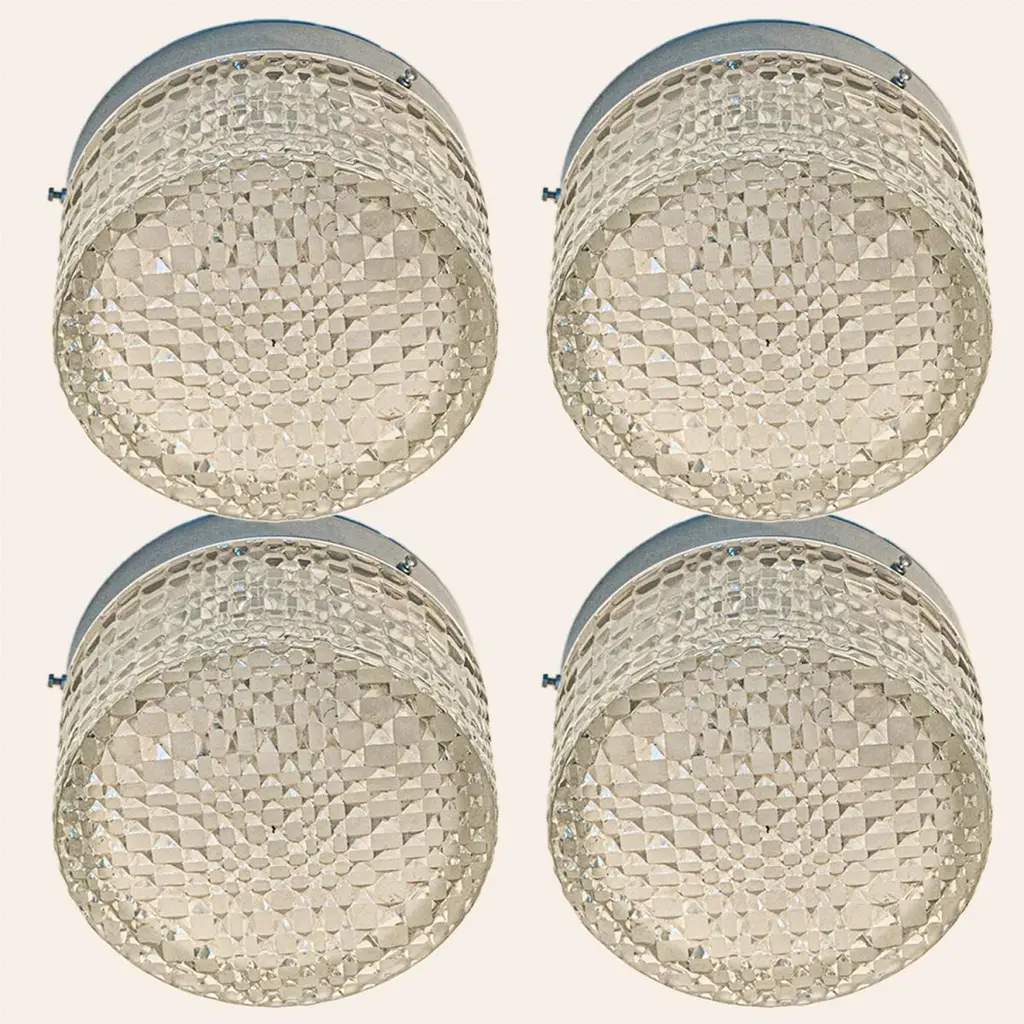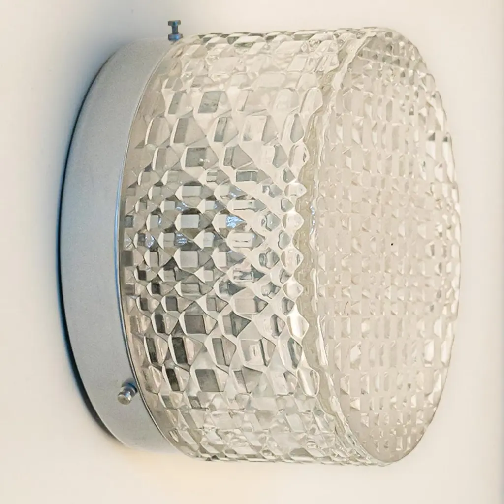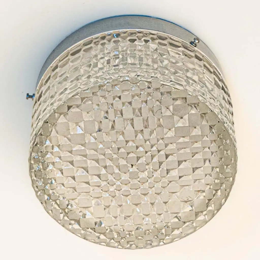 Beautiful clear crystal wall lights/flush mounts, manufactured in Germany in 1960. The glass is mounted on a silver colored back plate. The back plates can be delivered in different raw colors if required. Please ask for additional information.Can be used as a wall light or flush mount.Please notice the price is for one piece. several pieces available.Dimensions:Diameter: 6.69″ (17 cm)Depth: 4.33″ (11 cm)Cleaned and well-wired, in full working order and ready to use. The frame is in very good condition. The wall lights can be disassembled and the glass individually wrapped for easy transport. The fixture requires 1 E27 standard bulb. Also LED compatible.