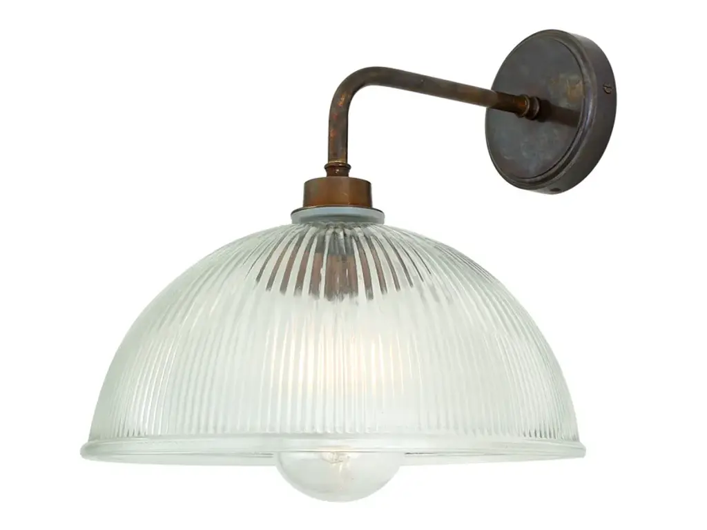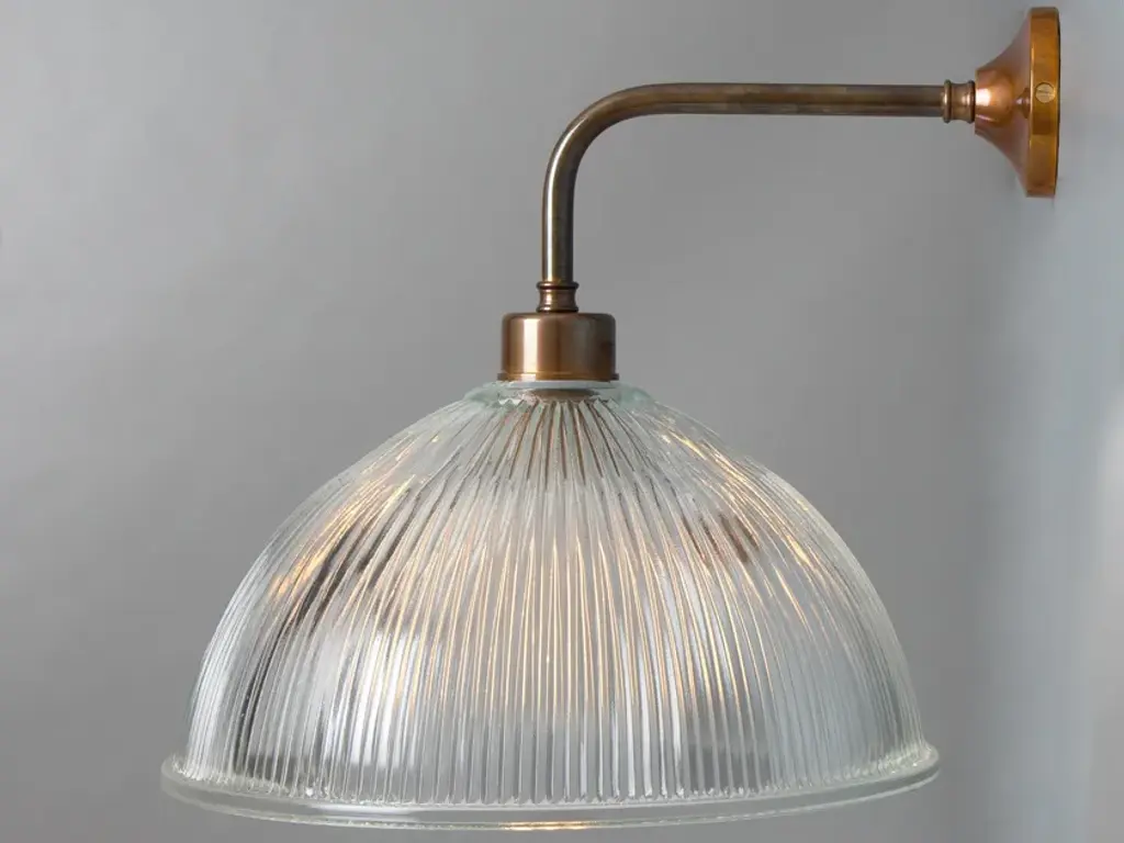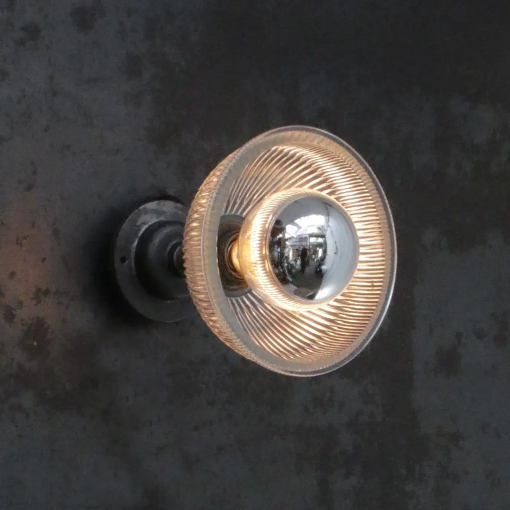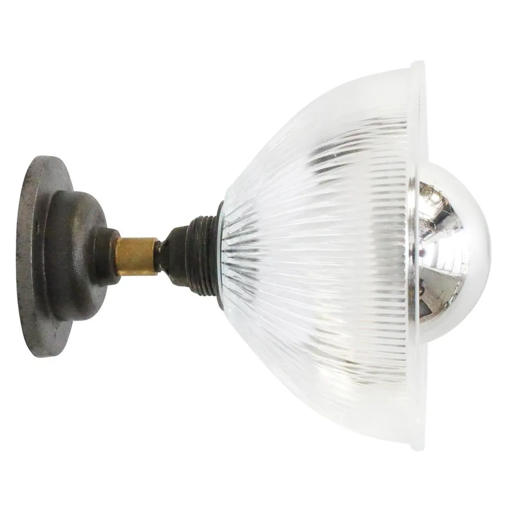 Holophane glass wall lightmetal bulb holder with clear striped glass shadecast iron wall mount diameter 10.5 cm / 4”wall lamp / ceiling SconceWeight: 1.68 kg / 3.7 lbPriced per individual item. All lamps have been made suitable by international standards for incandescent light bulbs, energy-efficient and LED bulbs. E26/E27 bulb holders and new 110 volt or 220 volt wiring are UL Listed or CE certified. 100% safe. They can be set in operation immediately. Contact us for shipping prices for larger quantities. Excluding light bulb.