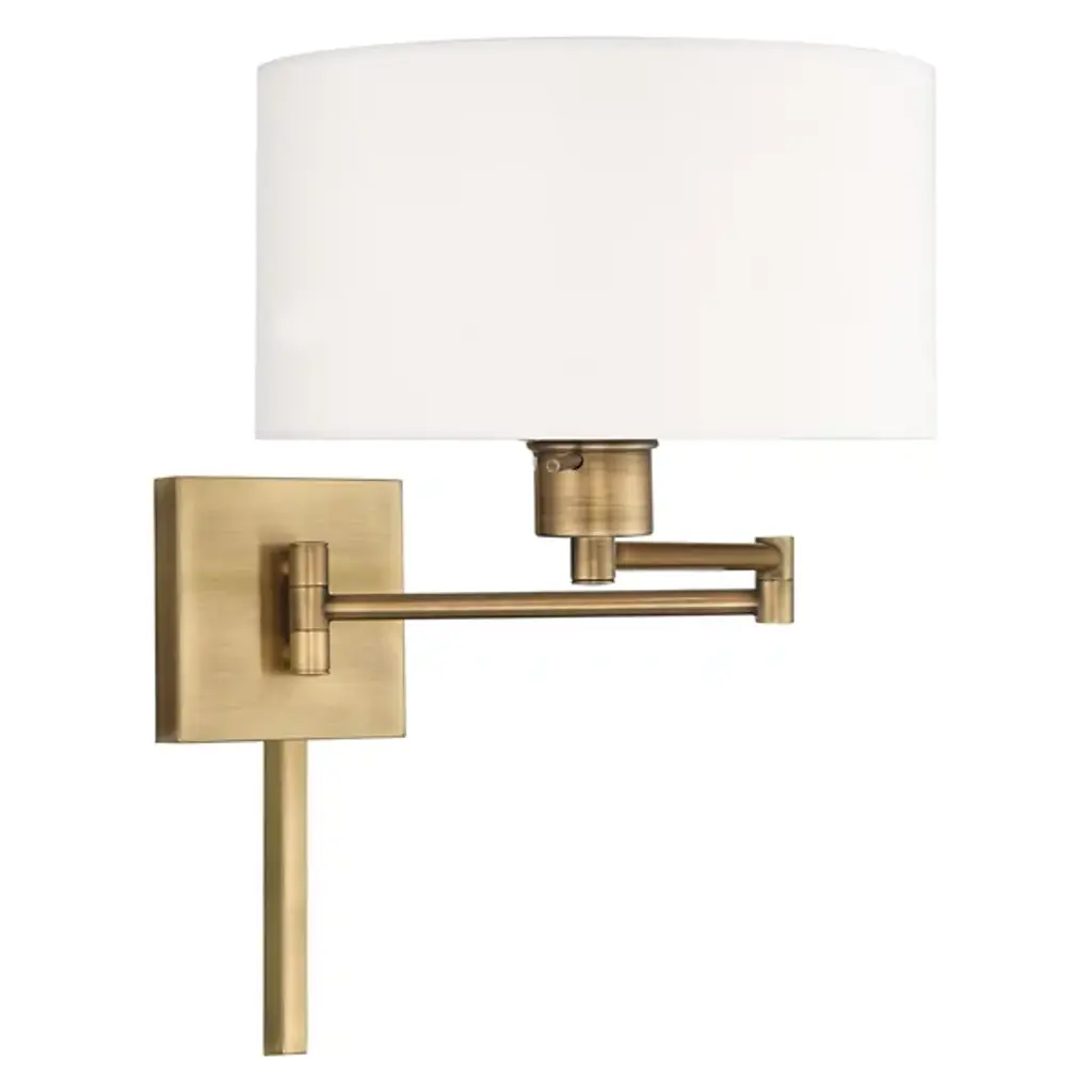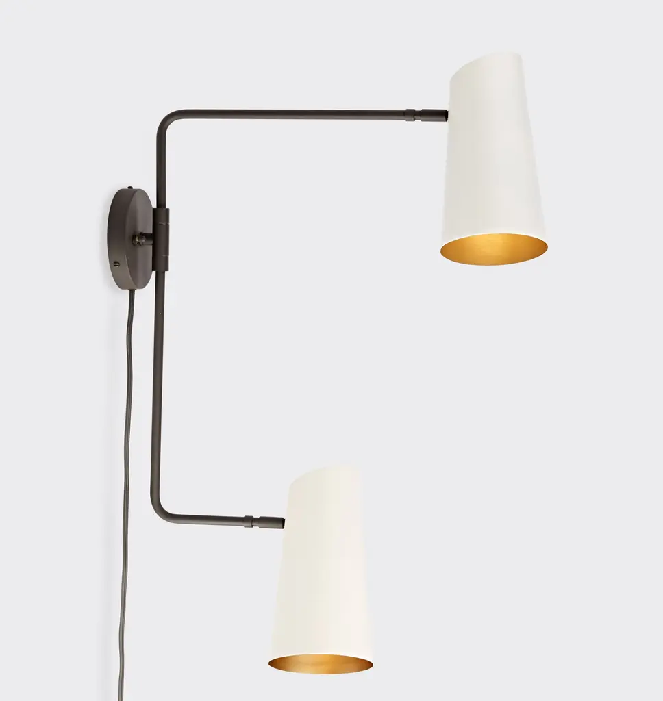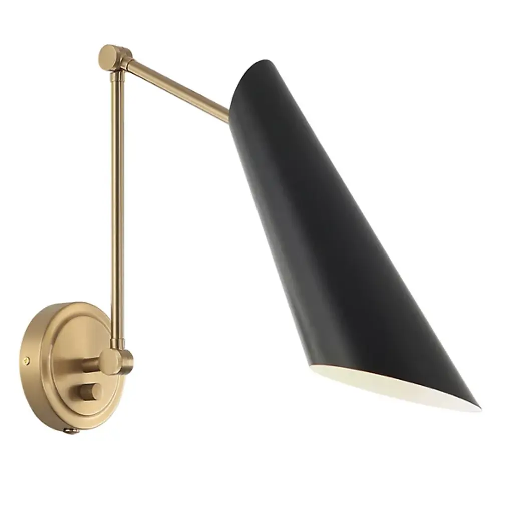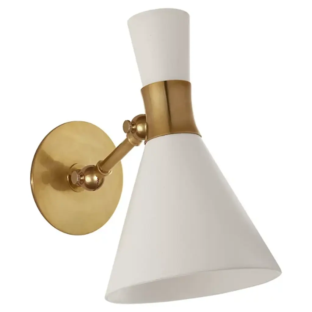 Trimmed in hand-rubbed, antiqued brass and white, this sleek sconce flaunts an adjustable, slender neck and flared shade full of retro flair. Hardwired.