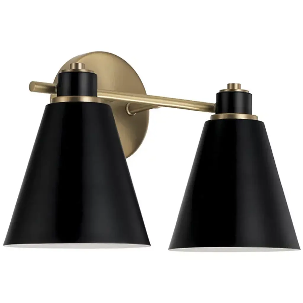 Trimmed in a hand-rubbed, antiqued finish, this brass sconce flaunts slender arms and flared shades full of retro flair. Hardwired.