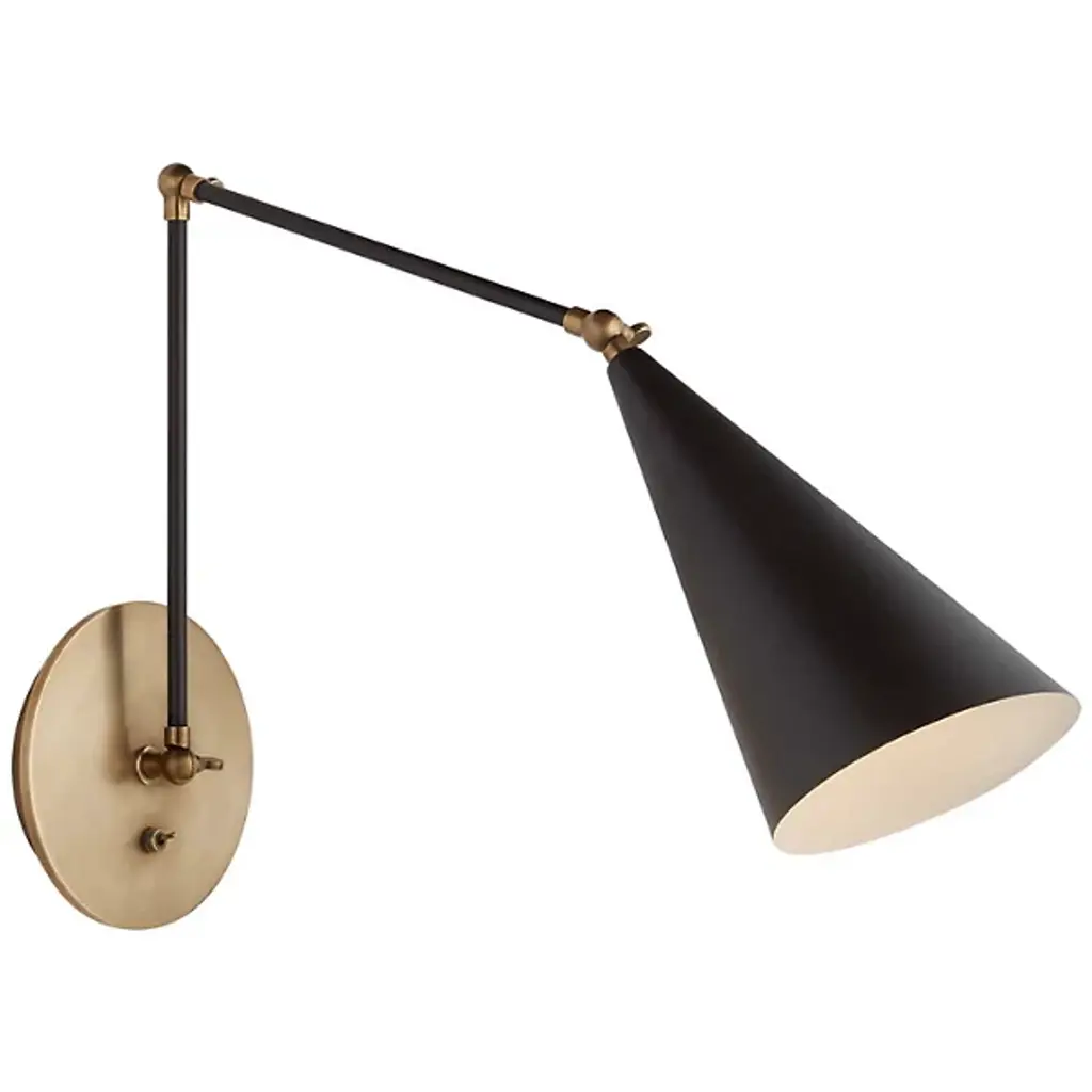 Evoking a modern silhouette, the Clemente Wall Sconce was designed by AERIN for Visual Comfort Signature, formerly known as Visual Comfort, of New York. The cone shape of the aluminum shade contrasts nicely with the metallic finish of the mounting plate and minimal fixtures. Concentrated light casts through the aperture of the shade, which can be adjusted on the hinged arm for ultimate customization. This design can easily serve a multitude of purposes across the spectrum of business and leisure.