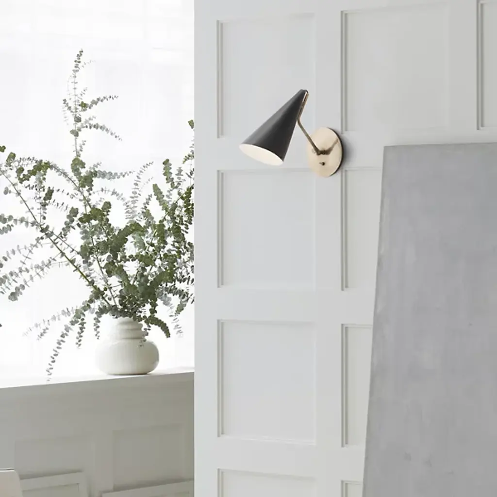 The Clemente Wall Sconce by Visual Comfort Signature, formerly known as Visual Comfort, provides simple, stylish lighting with a dash of transitional flair. Its design features an adjustable conical shade with distinct interior and exterior finishes that stand out beautifully once the fixture is lit. An angled arm and circular wallplate provide support while adding a rustic aesthetic that leaves a lasting impression.