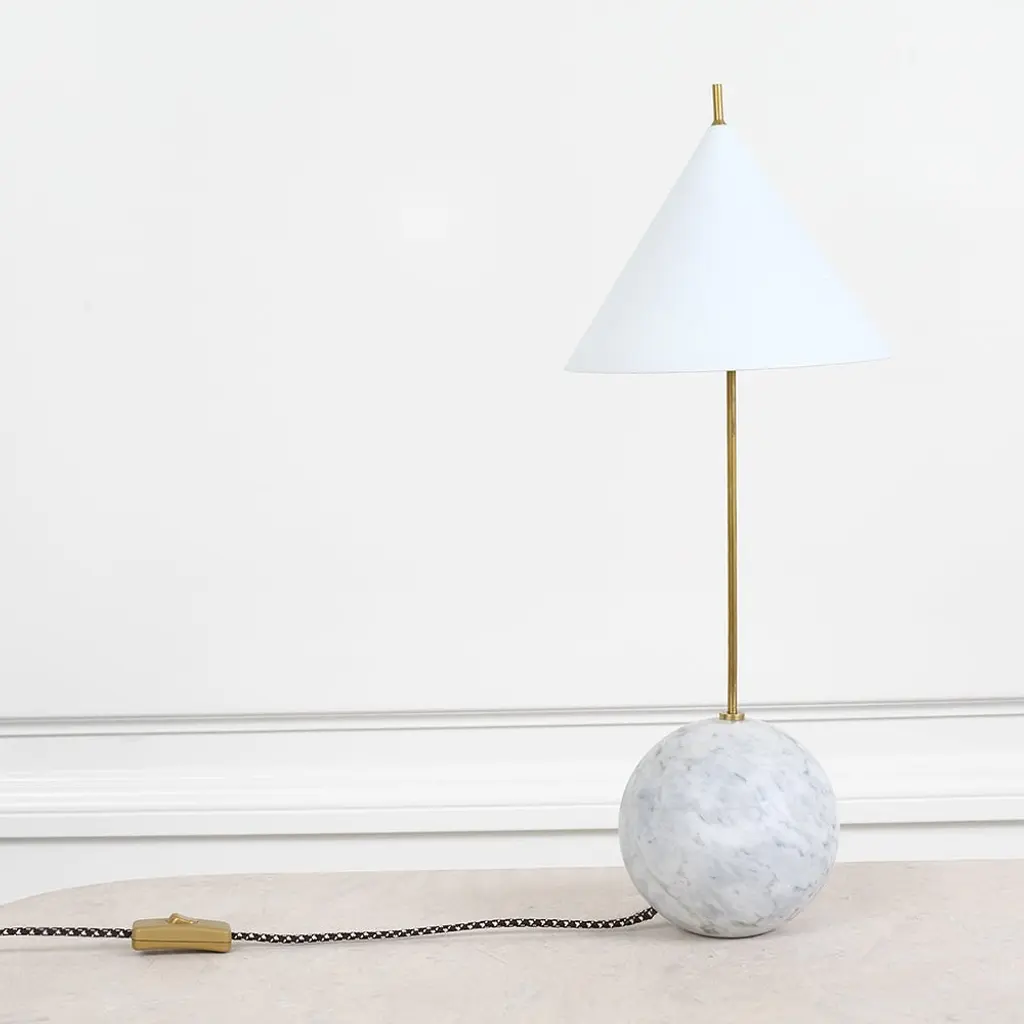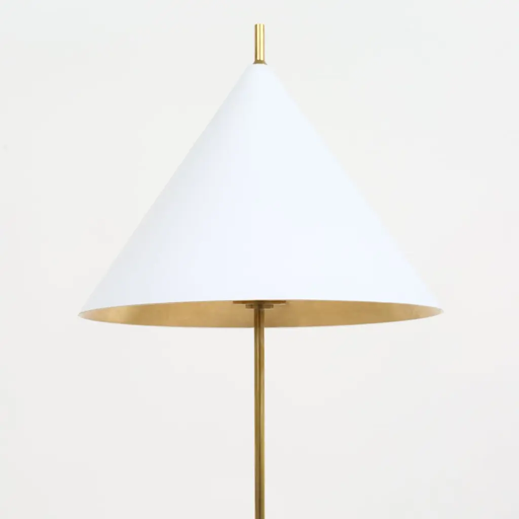 A dramatic and architectural use of mixed metals and geometric forms, this refined and bold lamp juxtaposes organic feminine curves with sleek masculine precision. Its distinctive voice is full of modern sophistication and soul. Available in Antique-Burnished Brass with Antique White Shade or Antique Black Shade. International Orders: Lead times and availability vary for non-US 120V fixtures. Please contact us for all international inquiries.