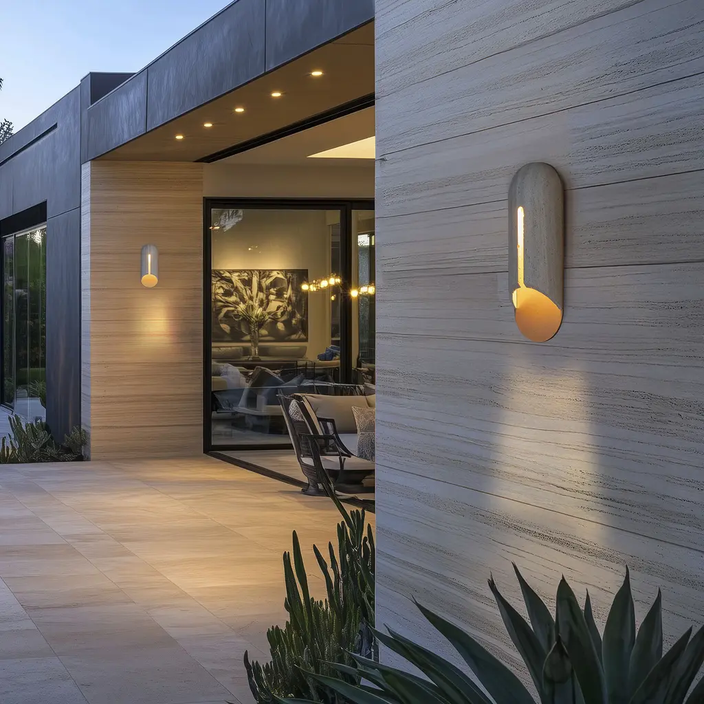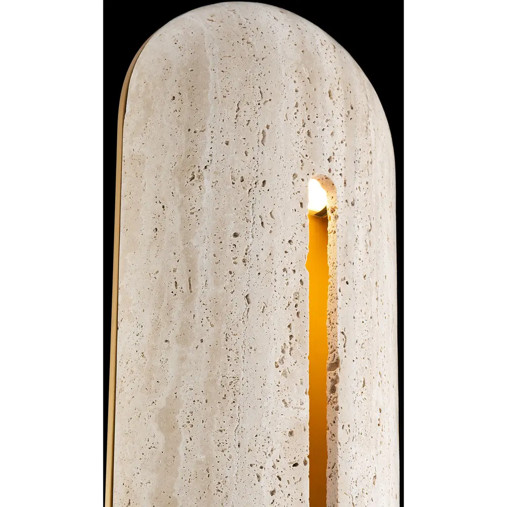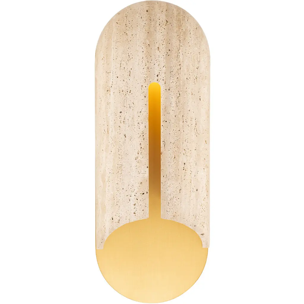 A graceful arch of stone pays tribute to the timeless role of this material in architectural design. Mounted on an oval plate, the Clog outdoor wall luminaire emits light through a central carved line, with warm downlighting reflecting off its metal surface. Clog is offered in 16 and 22-inch sizes and is available in a choice of basalt stone and black, or beige travertine and aged brass finish combinations.