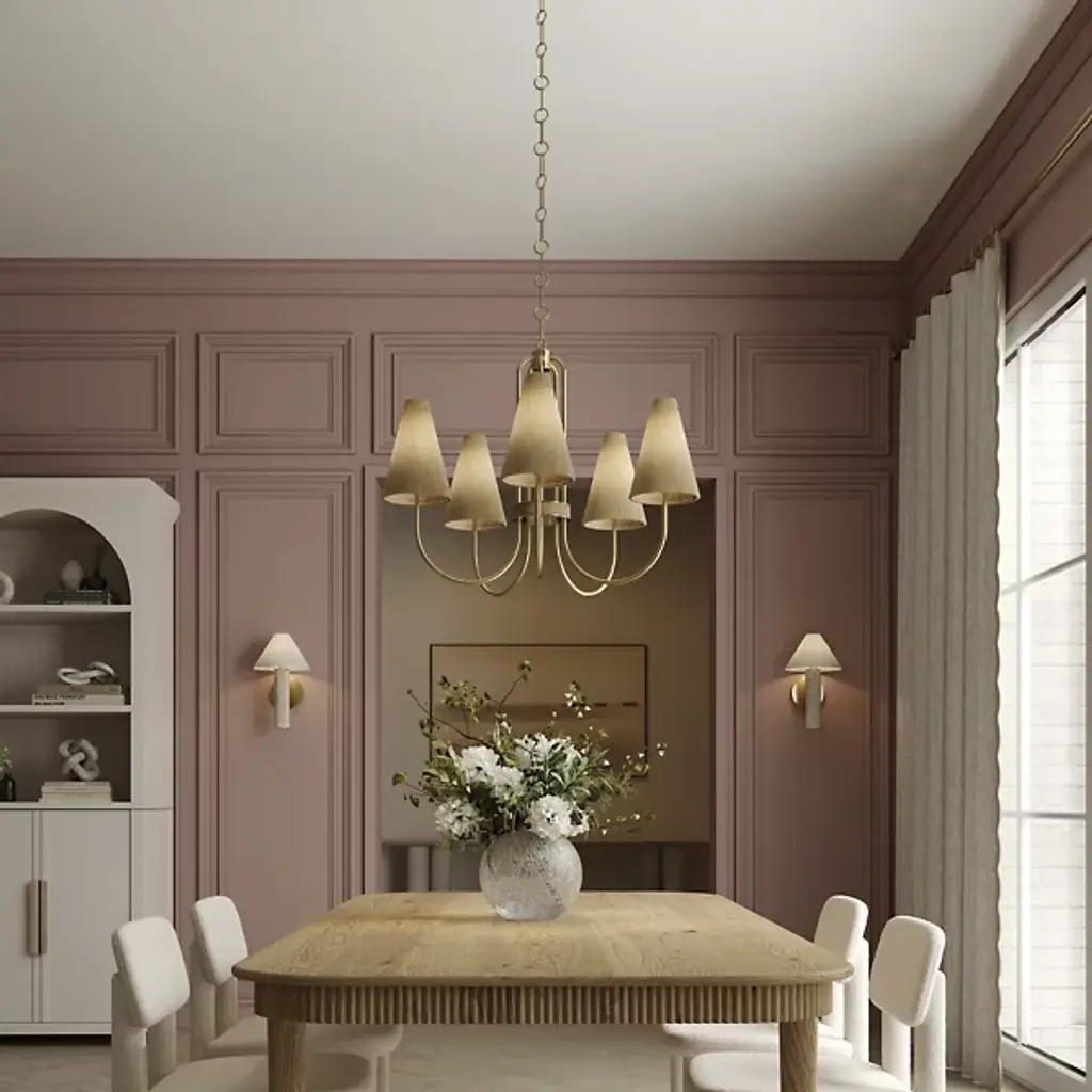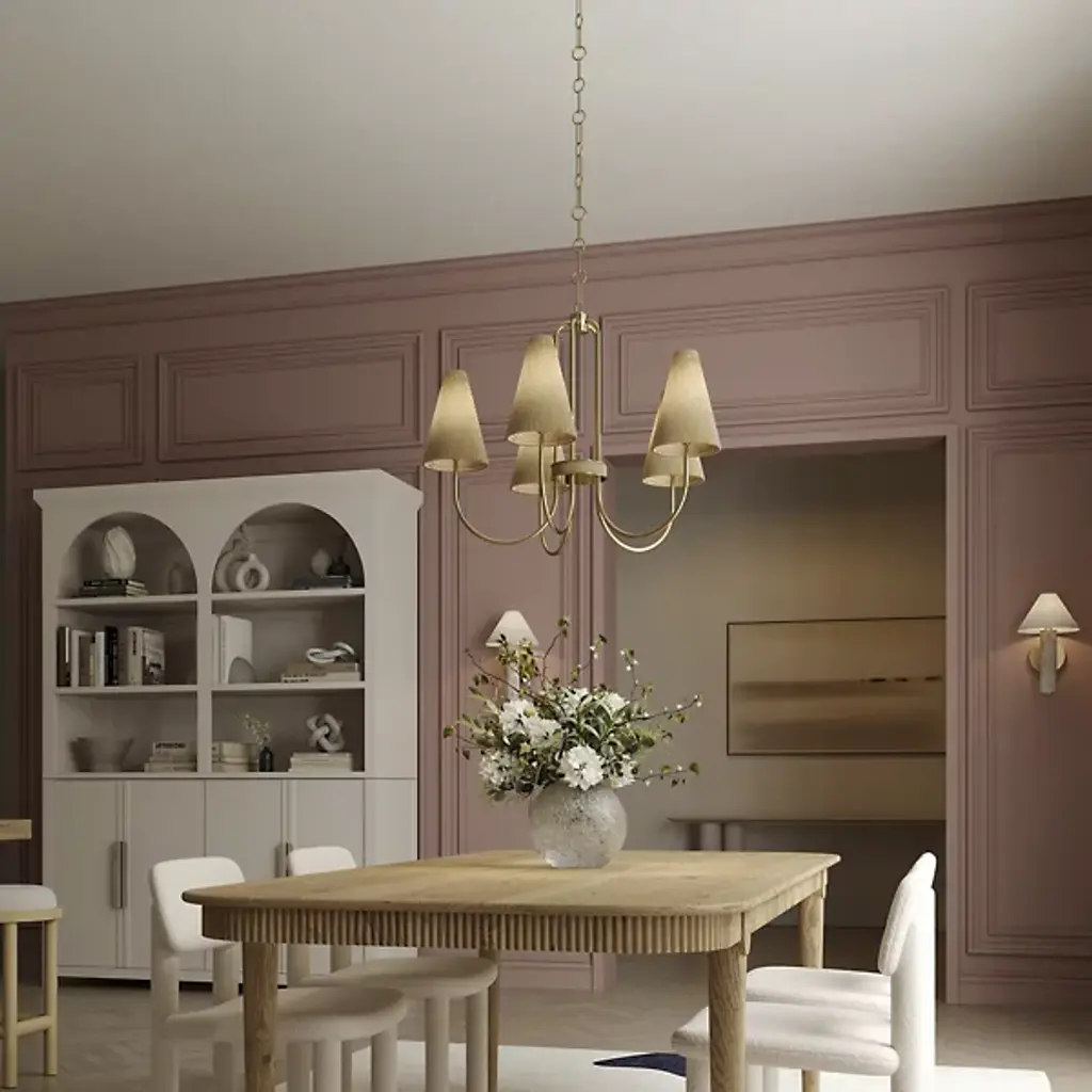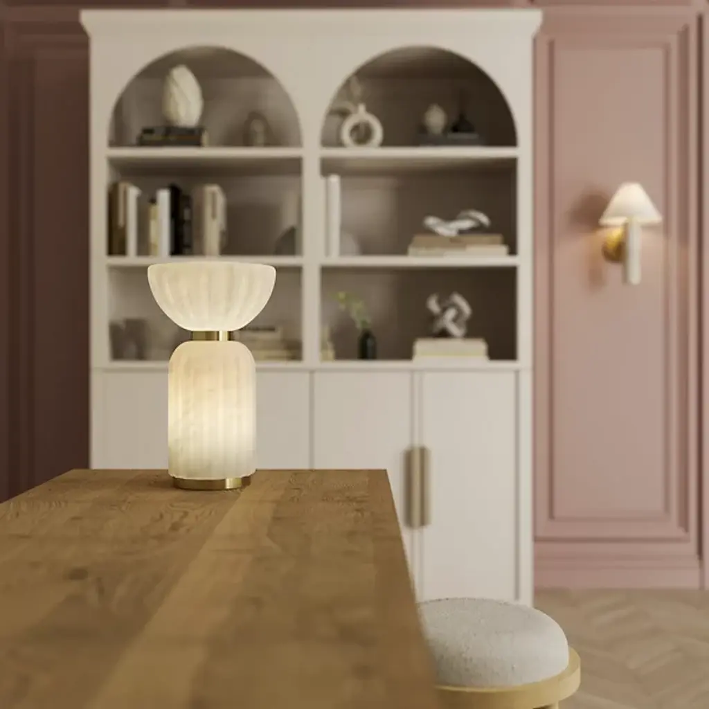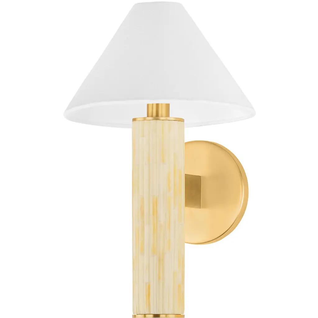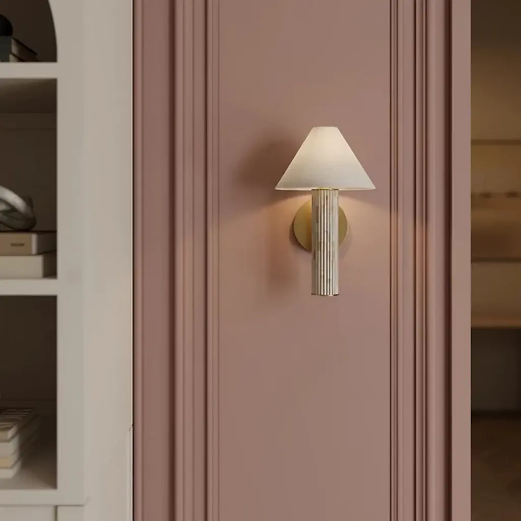 The Clover Wall Sconce from Mitzi draws inspiration from Italian modernist design with its column-like base featuring intricate fluted bone inlay. This handcrafted detail provides a subtle texture that changes character as light plays across its surface throughout the day. A simple conical linen shade allows the artisanal base to remain the focal point while providing practical diffusion of light. The brass accent at the neck introduces a touch of warmth that connects this piece to classical references while maintaining contemporary relevance. This sconce brings an architectural presence to powder rooms, hallways, or dining areas where its sculptural qualities can be properly appreciated up close.