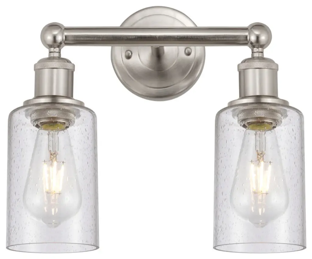 INNOVATIONS 516-2W-WPC-G804 Clymer 2 16 inch Bath Vanity Light White and Polished Chrome. Style: Art Nouveau, Transitional, Modern . Collection Name: Ballston. Metal Finish(Body): White and Polished Chrome. Metal Finish(Canopy/Backplate): White. Material: Steel, Cast Brass, Glass. Dimension(in): 9.875(H) x 13.875(W) x 6.0625(Ext). Bulb: (2)60W Medium Base Incandescent(Not Included). Voltage: 120. Dimmable: Yes. Color Temperature (Kelvin): 2200. Color Rendering Index (CRI): 99.9. Lumens: 220. Life Expectancy (Hours): 2000. Glass Shade Description: Seedy Clymer. Glass Type: Transparent. Shade Shape: Cylinder. Glass or Metal Shade Color: Seedy. Shade Material: Glass. Shade Dimension(in): 3.875(W) x 5.875(H). Fitter Measurement (Glass Or Metal Shade Fitter Size): Neckless with a 1.625 inch opening. Backplate Dimension(in): 4.5(H) x 6(W) x 0.75(Depth). ADA Compliant: No. California Proposition 65 Warning Required: Yes. UL/ETL Certification Type: Damp Location.