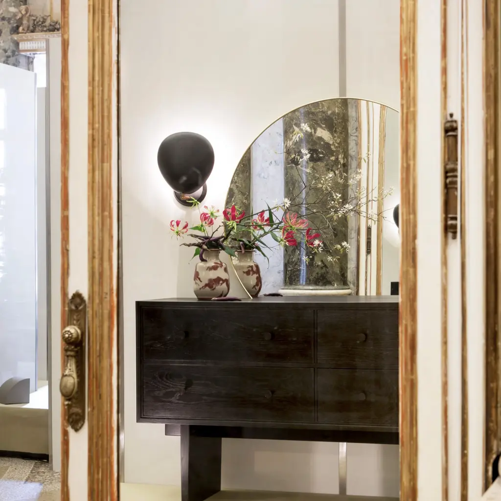 Taking its name from the oval shade and neck that wittily resembles a snake’s hood, Greta M. Grossman's iconic light readily adapts to a wall version. The flexible shade can be adjusted 360 degrees, which creates a soft glow that spreads up the wall, making it the perfect illumination for entrances and hallways.