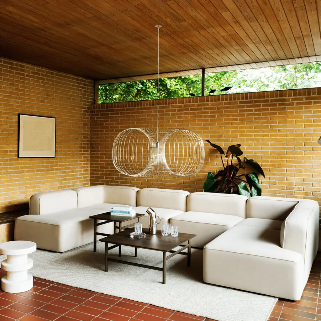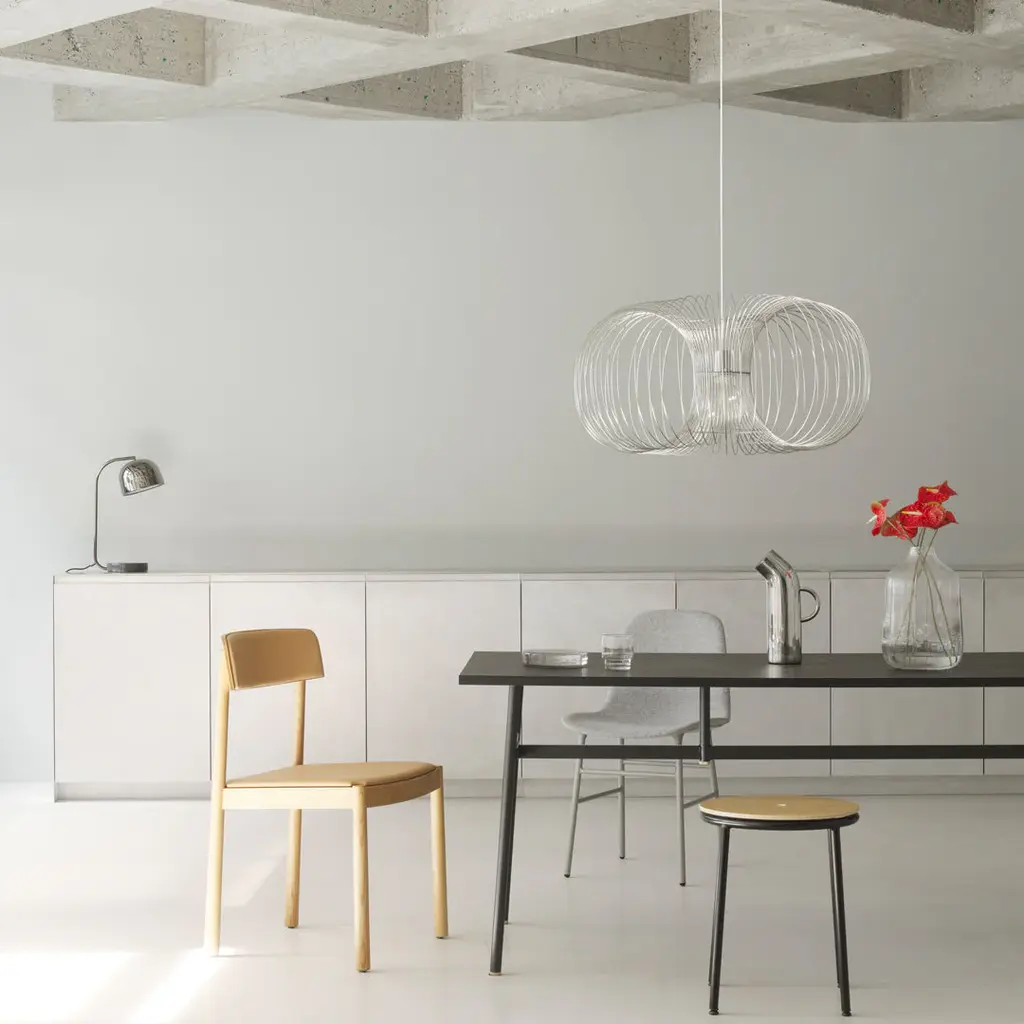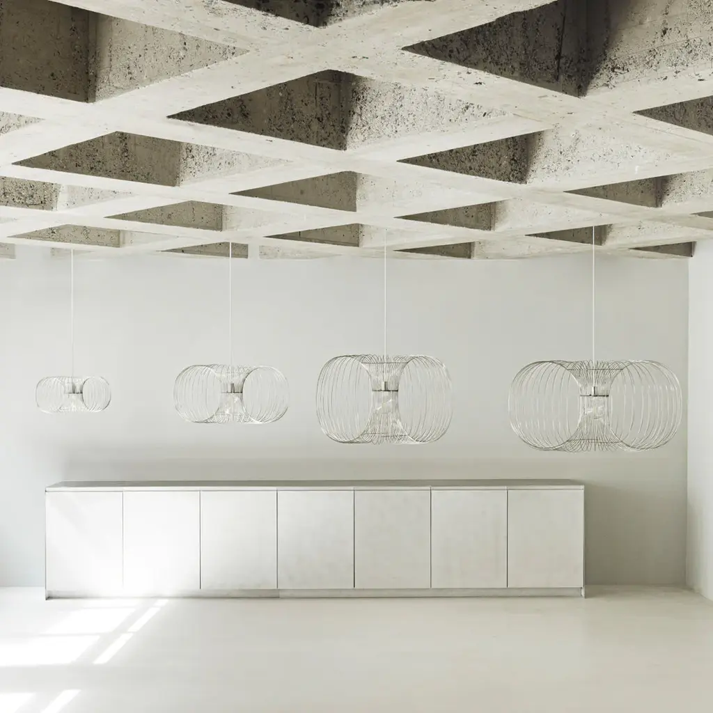 The new lamp collection Coil is designed with the wish to create as much volume as possible with as little material as possible. Coil is characterized by its rounded rectangle shape created by curved stainless-steel wires. The air between the wires makes the design appear light and airy despite its immense volume, making air as equally important for the design, as the material itself.The pendant is very simple in its design but will become an aesthetic focal point in any setting. This striking lamp appears as a fountain of metal looping its existence, creating a continuous and dynamic design. A sense of infinity. The collection is available in four different sizes, making it adaptable to both smaller residences and big, spacious environments. The different sizes can also be beautifully combined to create an interesting and sculptural arrangement either in the lobby, over a long dining table, or in a high-ceilinged hallway.